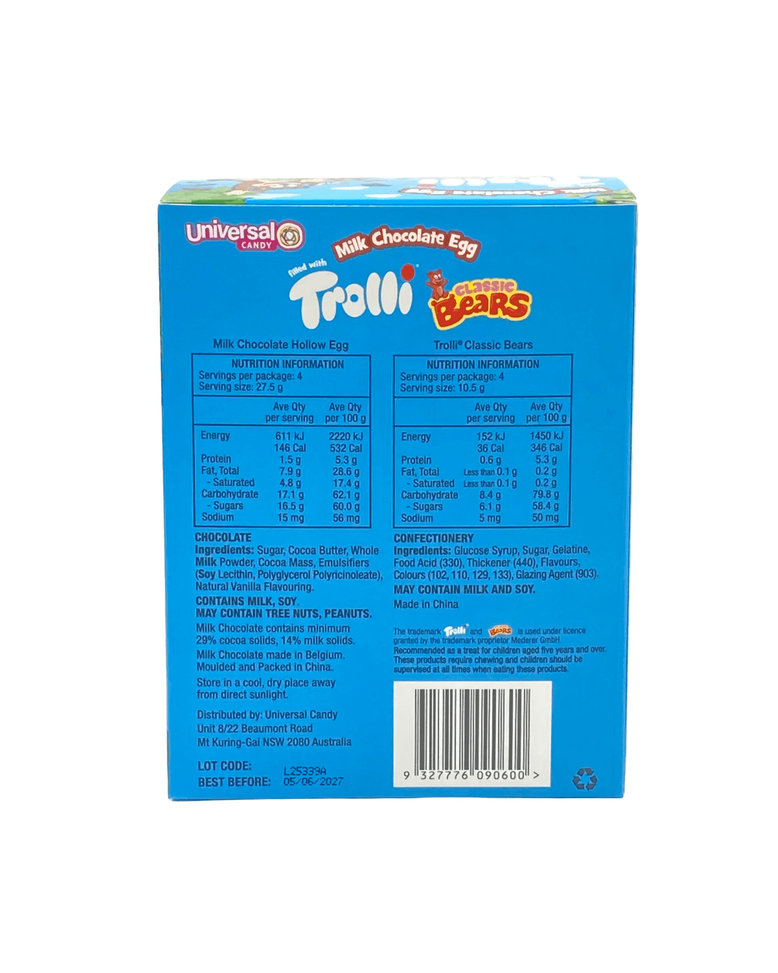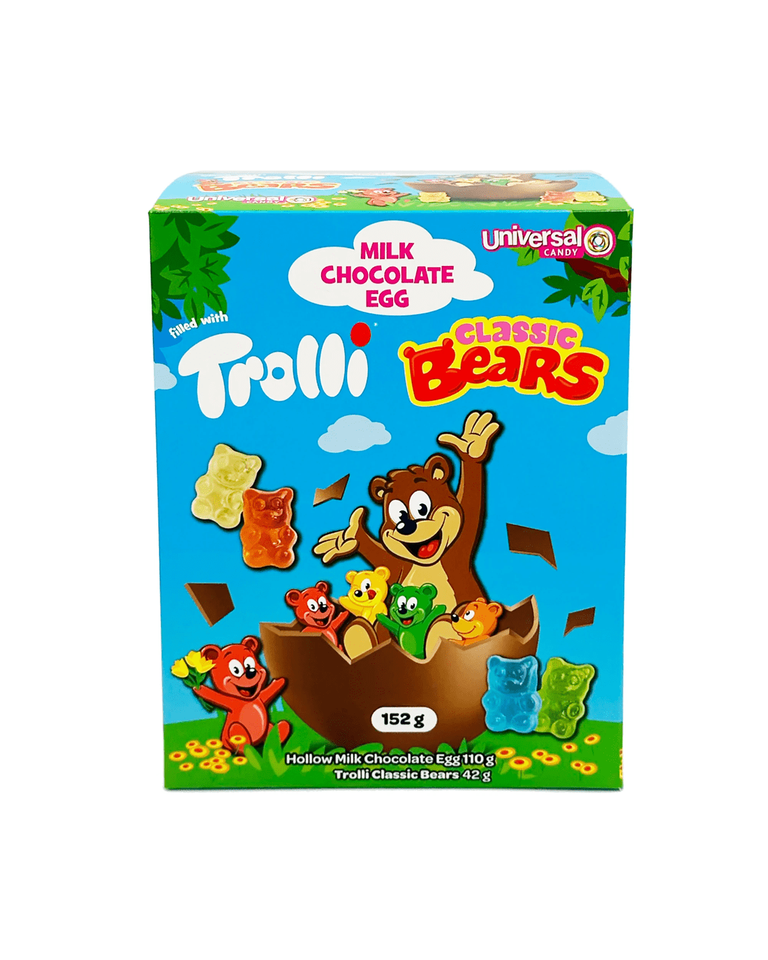 The Trolli Classic Bears Egg is a delicious chocolate Easter egg filled with fruity, chewy gummy bears. This sweet treat combines smooth, creamy chocolate with the fun, juicy flavours of classic gummy bears for a delightful Easter surprise.