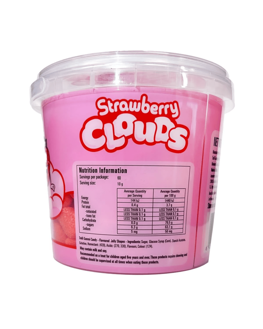 The Trolli Strawberry Clouds 600g tub is filled with fluffy, strawberry-flavoured gummy treats that are soft and delightful. Perfect for snacking and sharing, these sweet, cloud-like candies are a fun treat for all ages!