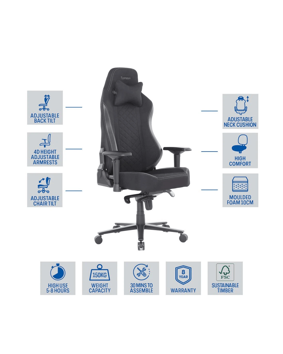 Sit back using the Typhoon Prime Fabric Chair. It has height, backrest tilt adjustment capabilities so you can customise your comfort to suit your needs. It has a fabric and foam seat, allowing for a cushioned sitting experience.