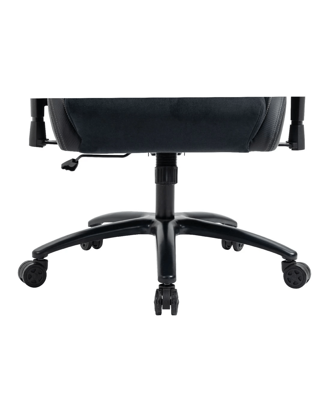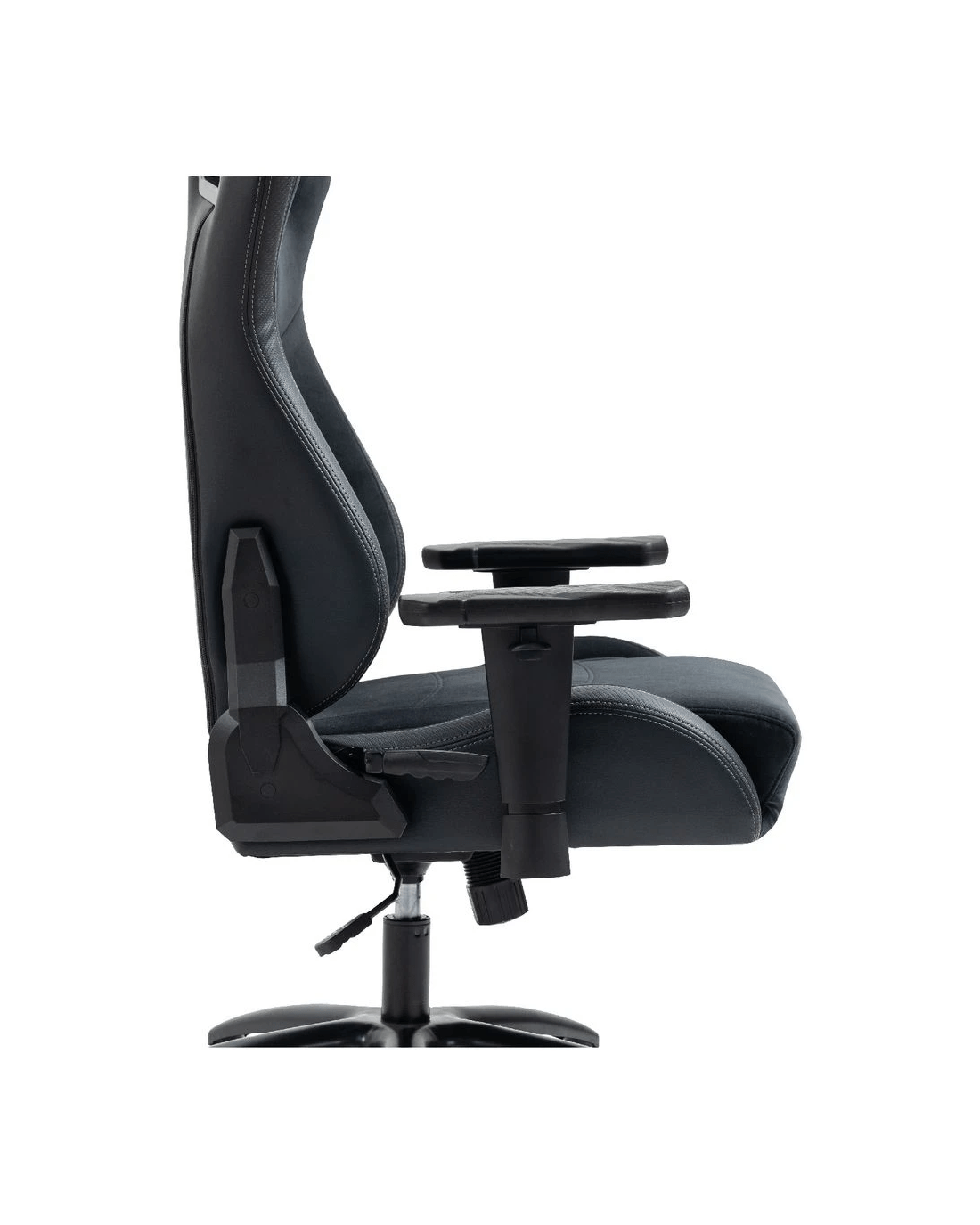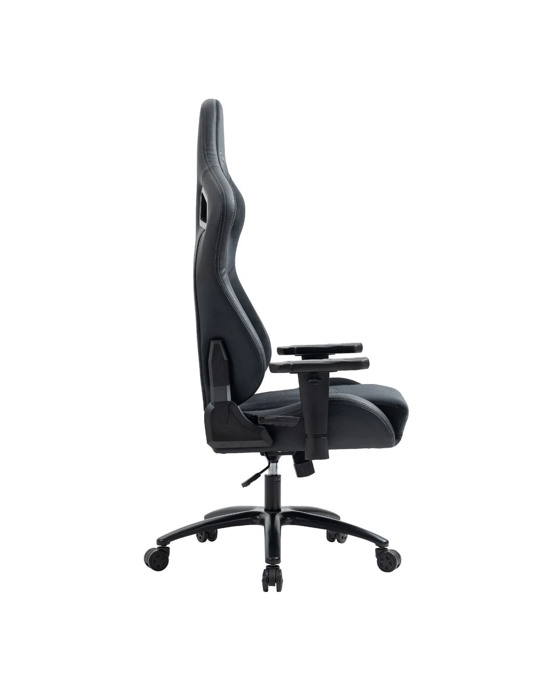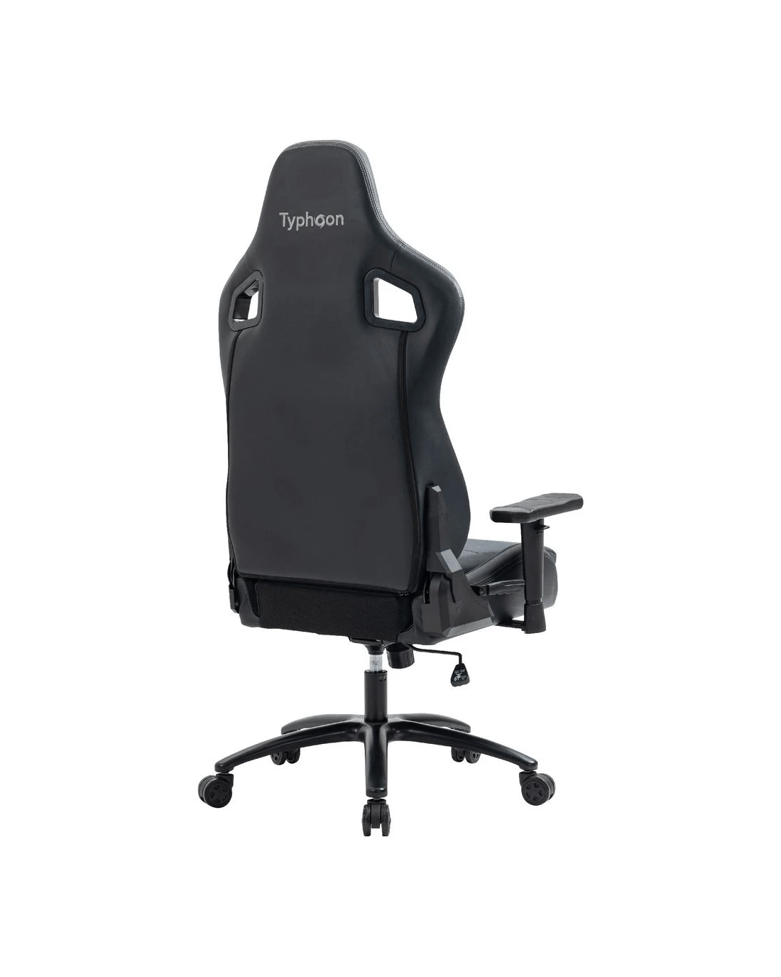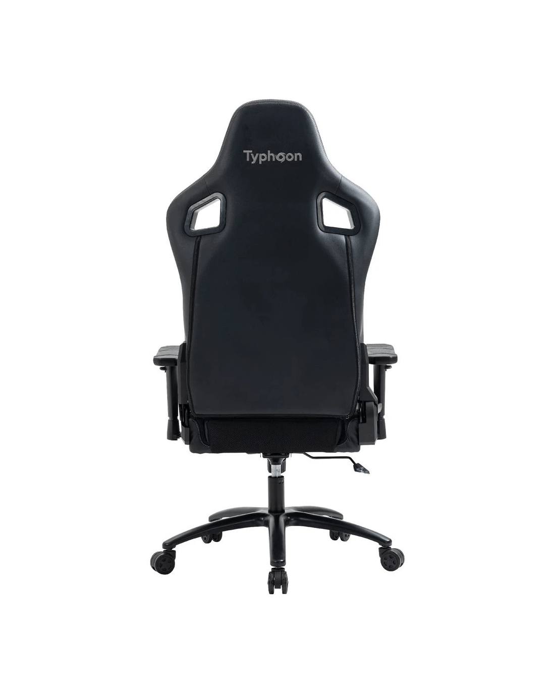 This Typhoon Viper XL High-Back Racing Game Chair is designed for big and tall gamers to sit in style and comfort. It features gas lift height adjustments as well 135 degrees of back reclining and a coil spring seat so you can find the position that gives you the most support. It has a black fabric upholstery, steel frame and five-star base that make up a stable structure and ergonomic design.