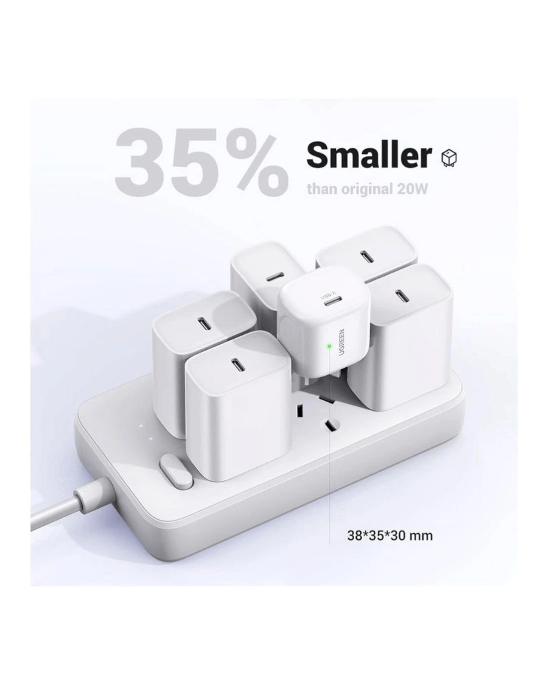 - It's designed to be 35% smaller than a standard 20W iPhone USB-C wall charger, so it won’t block other ports on the wall outlet.