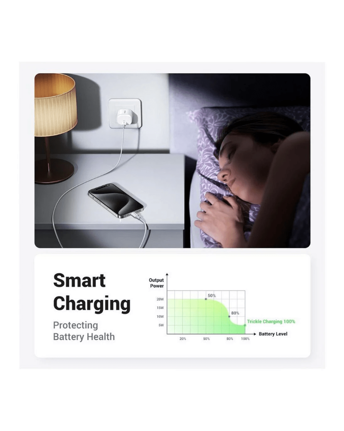 - It automatically matches the device’s current and has protections against over-current, over-voltage, and short-circuiting, ensuring safer overnight charging.