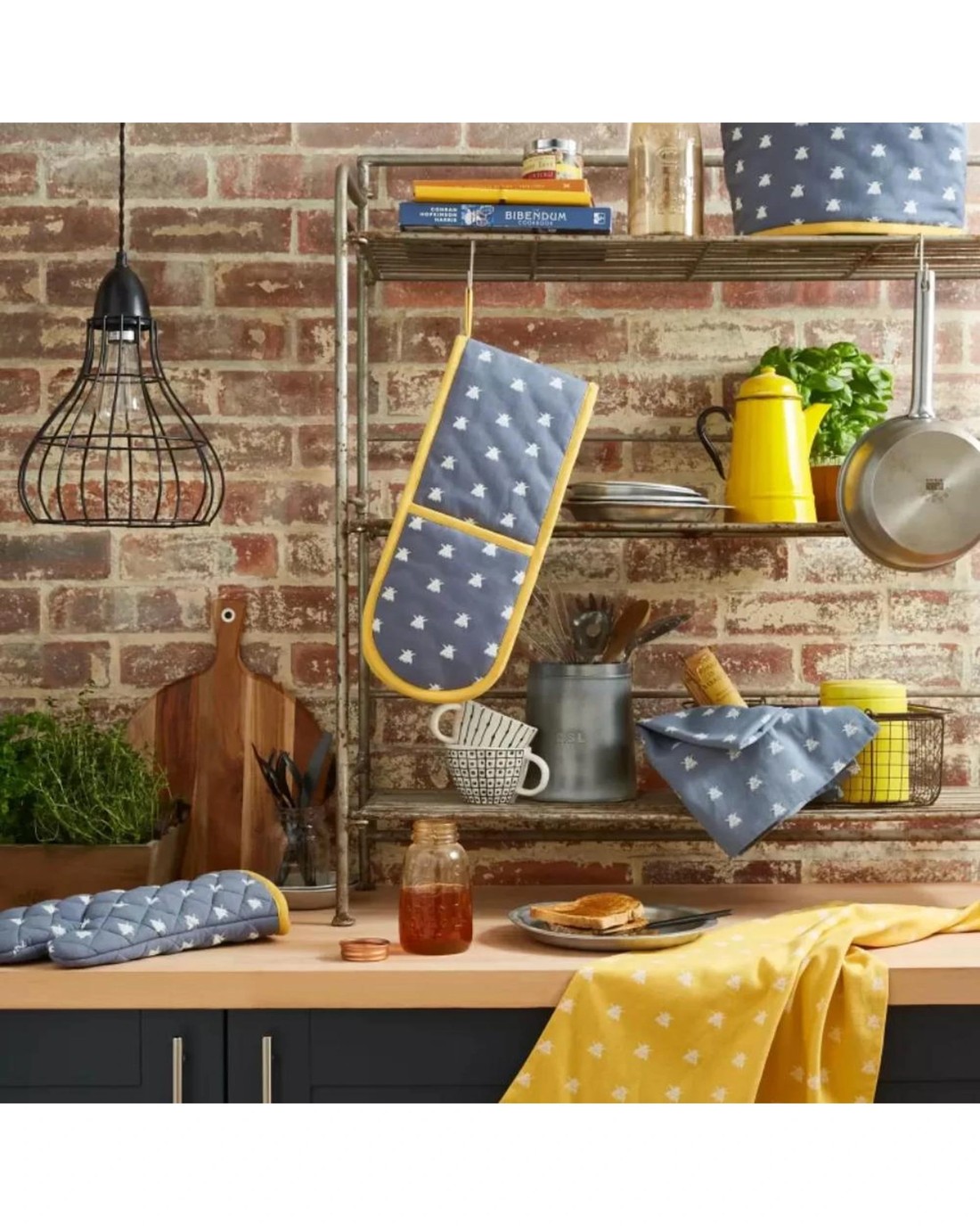 The minimalist bees in this print are uniquely bleached from the blue background. The bright yellow trim and accents on each piece offset this. Our Double Oven Gloves are made from natural cotton with polyester wading, and available in a selection of classic and modern Ulster Weavers' designs, all created by our in-house designers in Northern Ireland. They are ideal for handling hot pots and pans, as well as piping hot dishes straight out of the oven. Joined in the center our double oven gloves protect both hands, ensuring you don't get burnt when cooking up a storm in the kitchen or mastering chicken skewers on the BBQ.