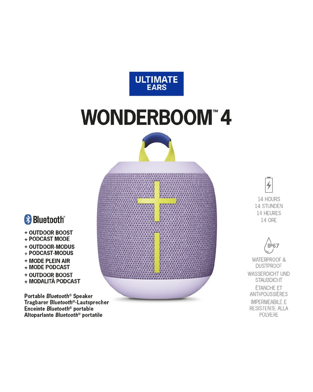 This Ultimate Ears Wonderboom 4 is an ultra-portable wireless speaker built to join you on your adventures. It's seriously waterproof and features surprisingly large 360° sound, deep bass, and a 14 hours of battery life. The IP67 rating means it's waterproof, dustproof and it even floats, so you can take it to the pool, the beach or even into the shower. Pair it with other Ultimate Ears speakers for even more fun.