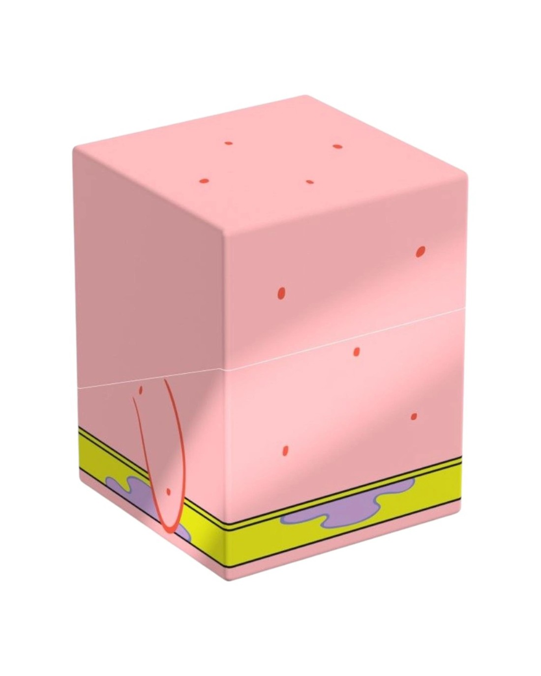 Collectible box for storing TCG decks, tabletop gaming accessories, and/or collectibles. The Patrick Squaroe from the Spongebob Squarepants edition holds up to 100 cards in double protective sleeves if used as a deck box. Squaroes are made from 78% renewable resources and fit perfectly into the separately available Collectors Case.