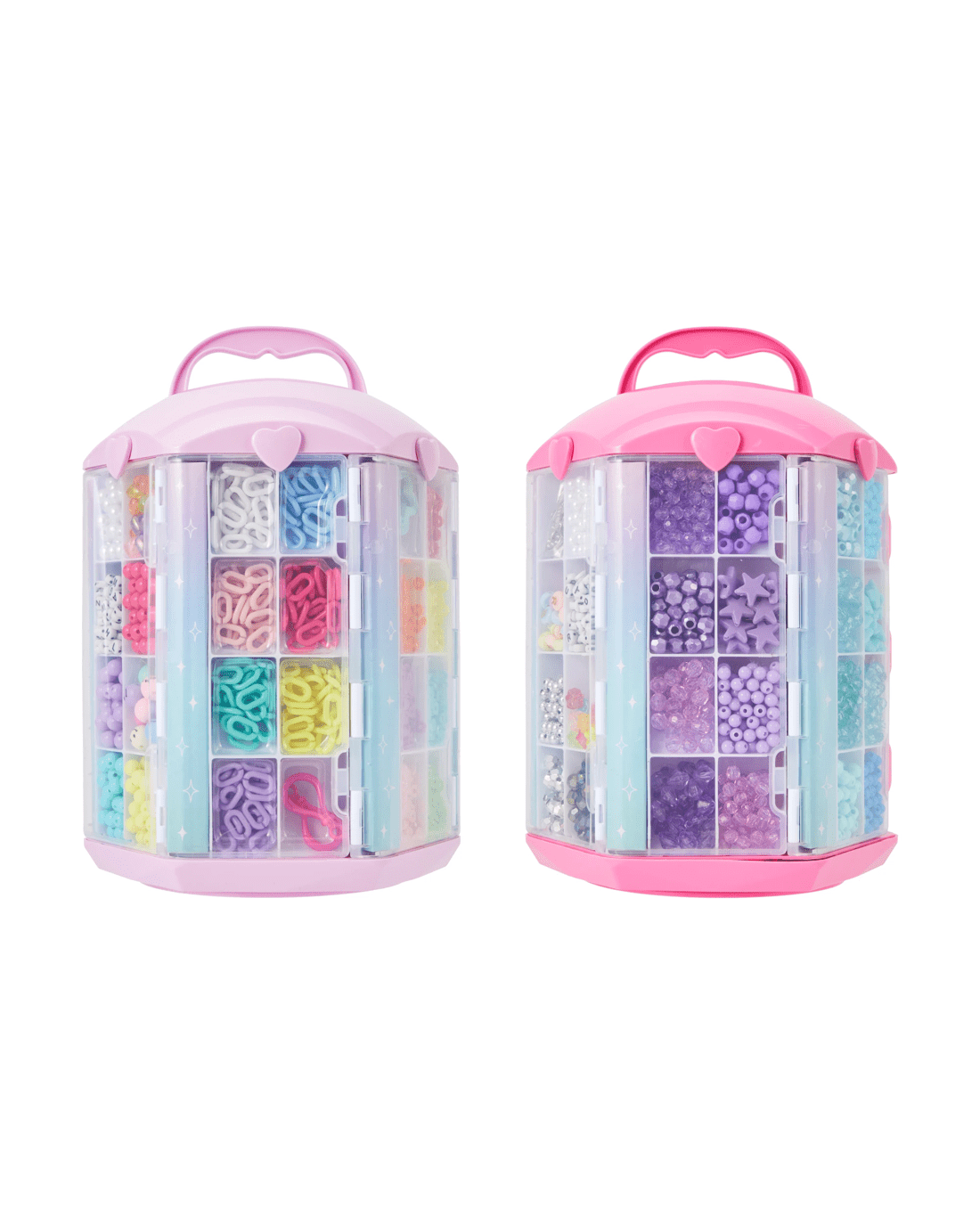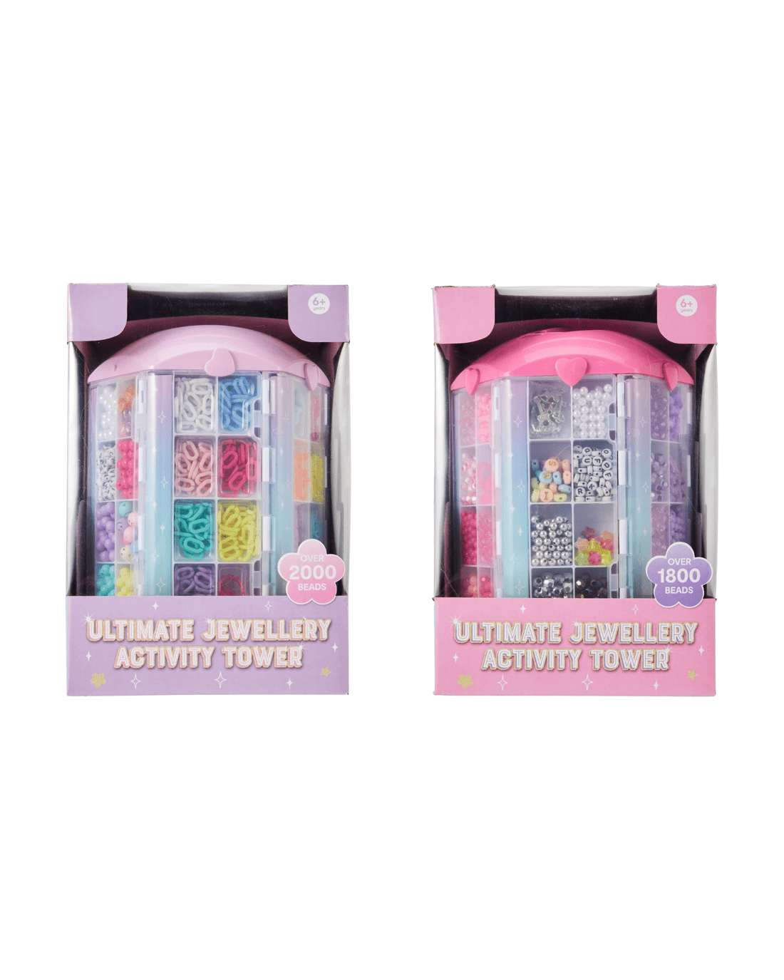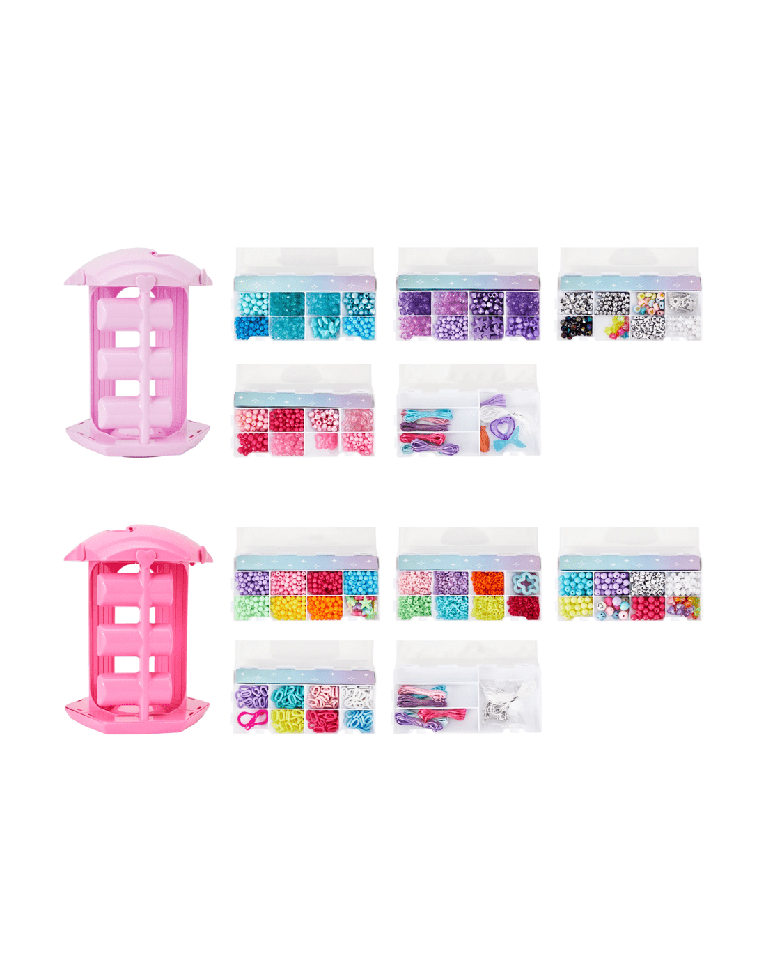 - Pink tower: 1800+ x beads, 1 x activity tower, 5 x removable storage trays, 6 x silver plastic charms, 2 x transparent charms, 10 x metal rings, 1 x transparent elastic string, 2 x tassel charms, 3 x satin cords and 3 x wax beading cords