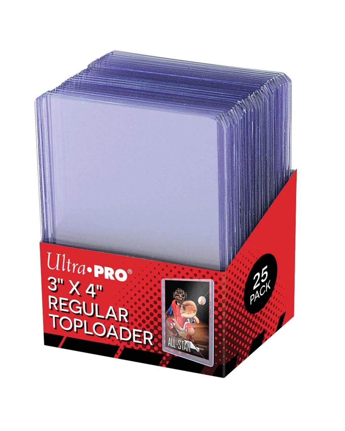 Protect your valuable collectible trading cards with the original Ultra PRO toploaders! These rigid plastic protectors are made with super clear PVC to keep your cards safe for storage, display, during trade and in shipments. With outer dimensions of 3" x 4", these toploaders are designed to safely store standard size cards (2-1/2" x 3-1/2") up to 35 points in thickness. Each pack comes with 25 individual toploaders. Recommended for use with Ultra PRO Card Sleeves and Premium Card Sleeves (items 81385 and 81126).