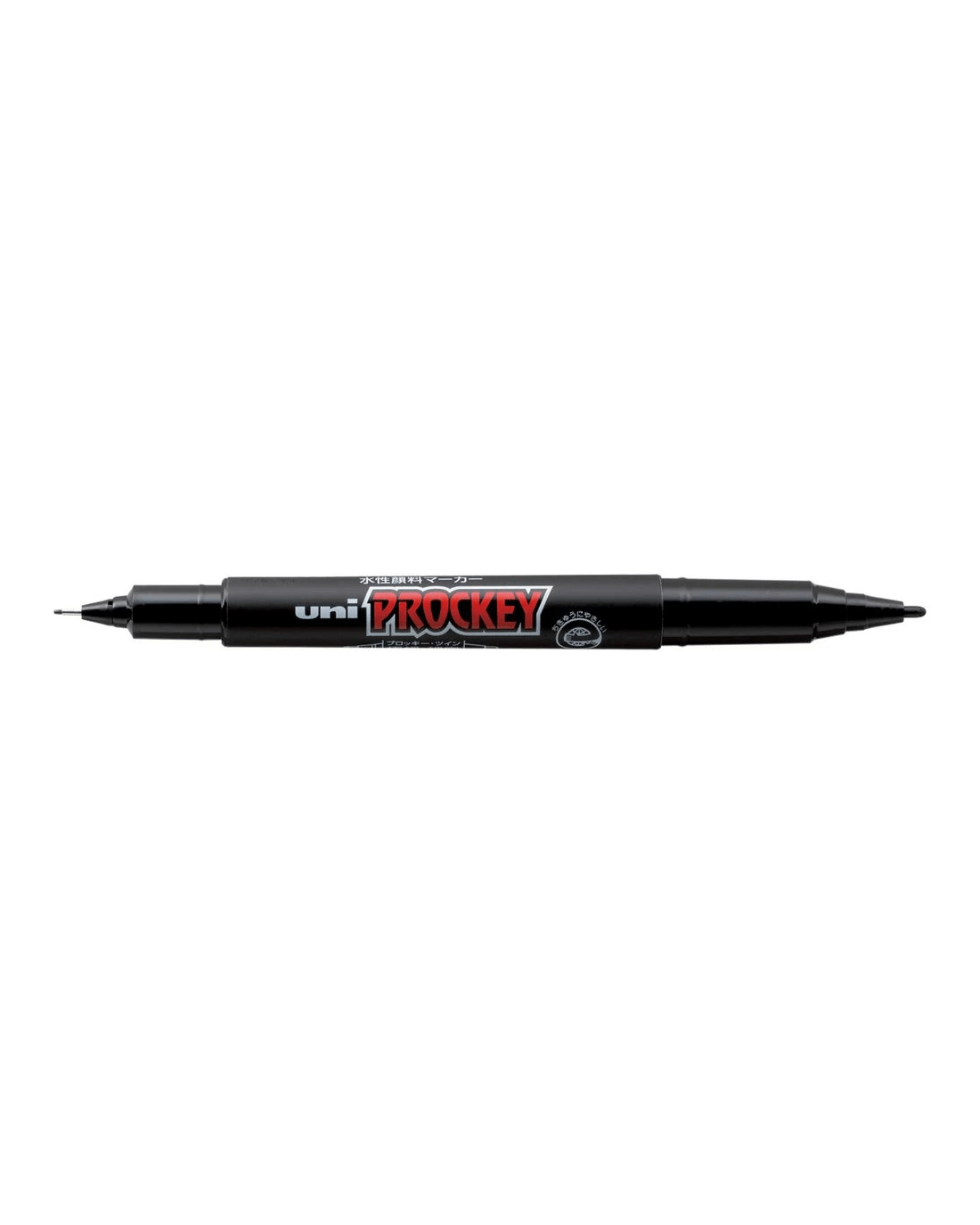 This Uni-ball Prockey Permanent Marker has a dual-ended design with a fine bullet tip on one end and a medium bullet tip on the other. It contains permanent ink and can be used to mark on a variety of different surfaces.