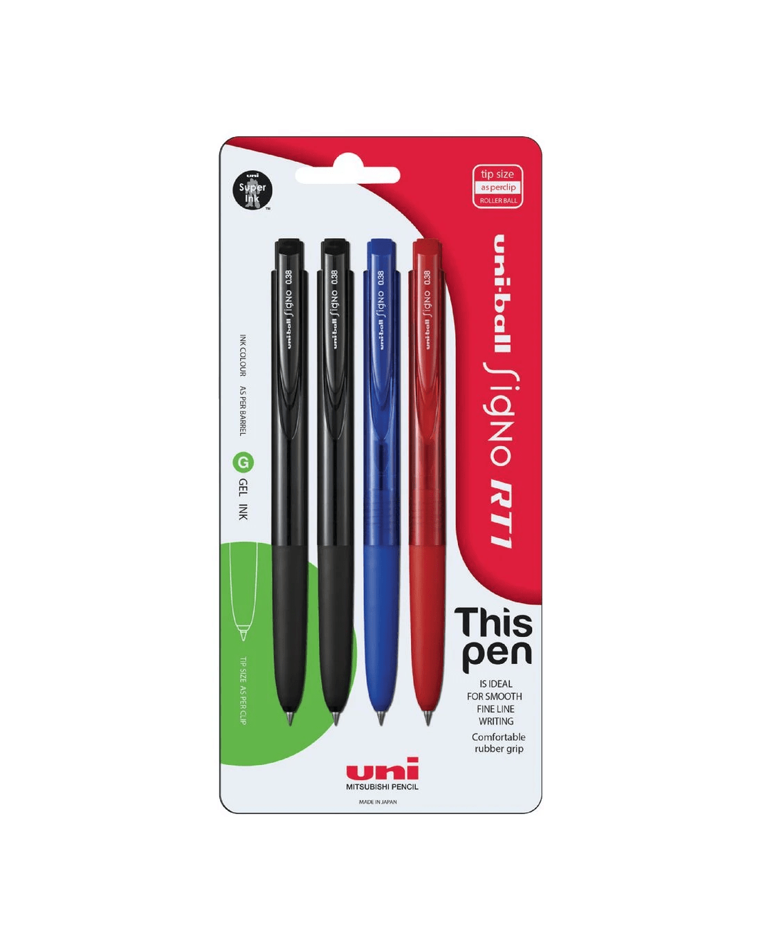 The Uni-Ball Signo RT1 Gel Pen has a modern design with a rubberised grip for comfortable writing. It contains Uni Super Ink which has a smooth gel consistency and is permanent once dry. Plus, it's retractable to ensure the 0.38 mm tip is protected when you're not using the pen.