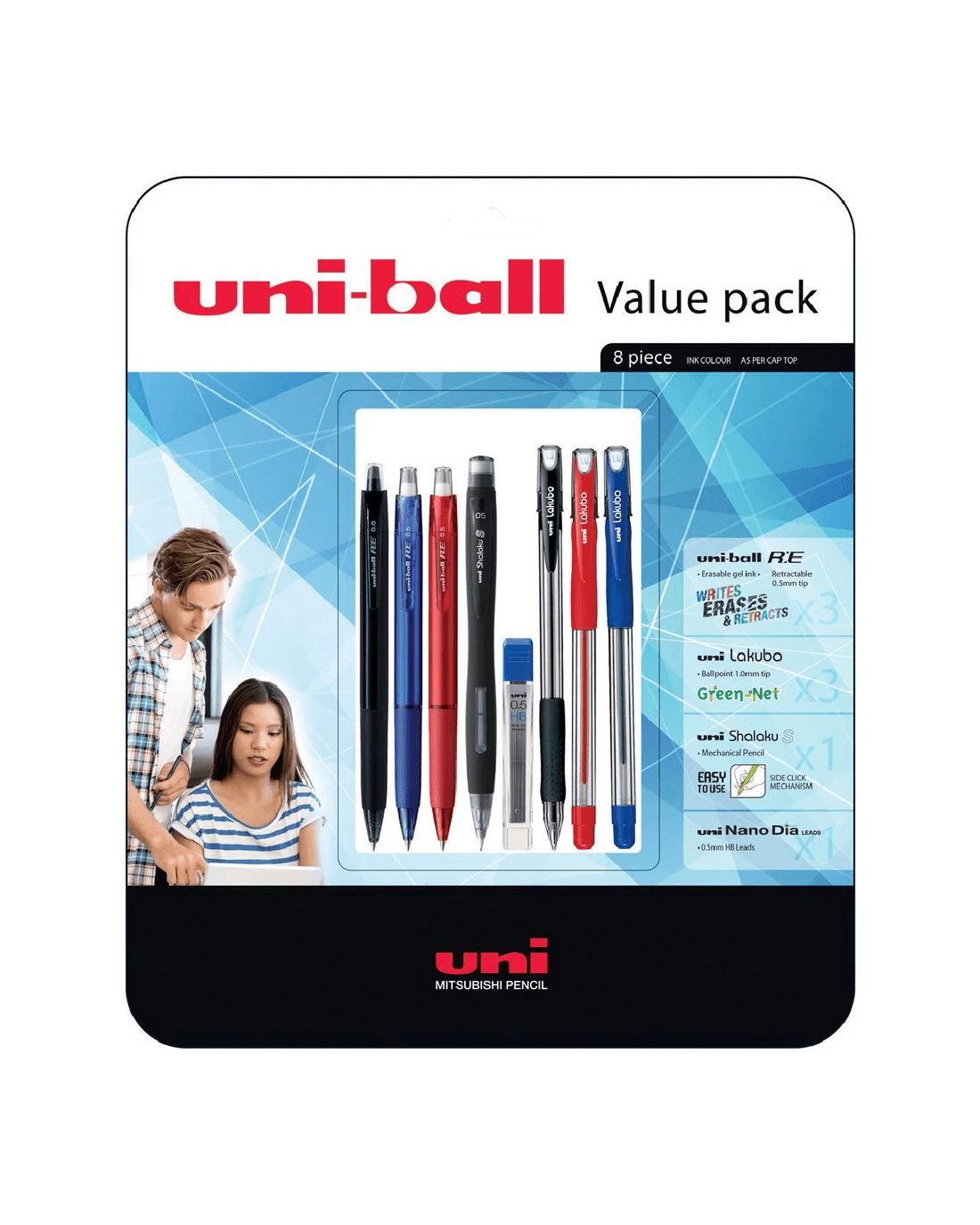 This Uni-Ball Writing Pack includes various stationery items so you can stock up on essential writing tools. The set includes gel and ballpoint pens for smooth writing, a mechanical pencil and refills so you can continue using your favourite pencil.