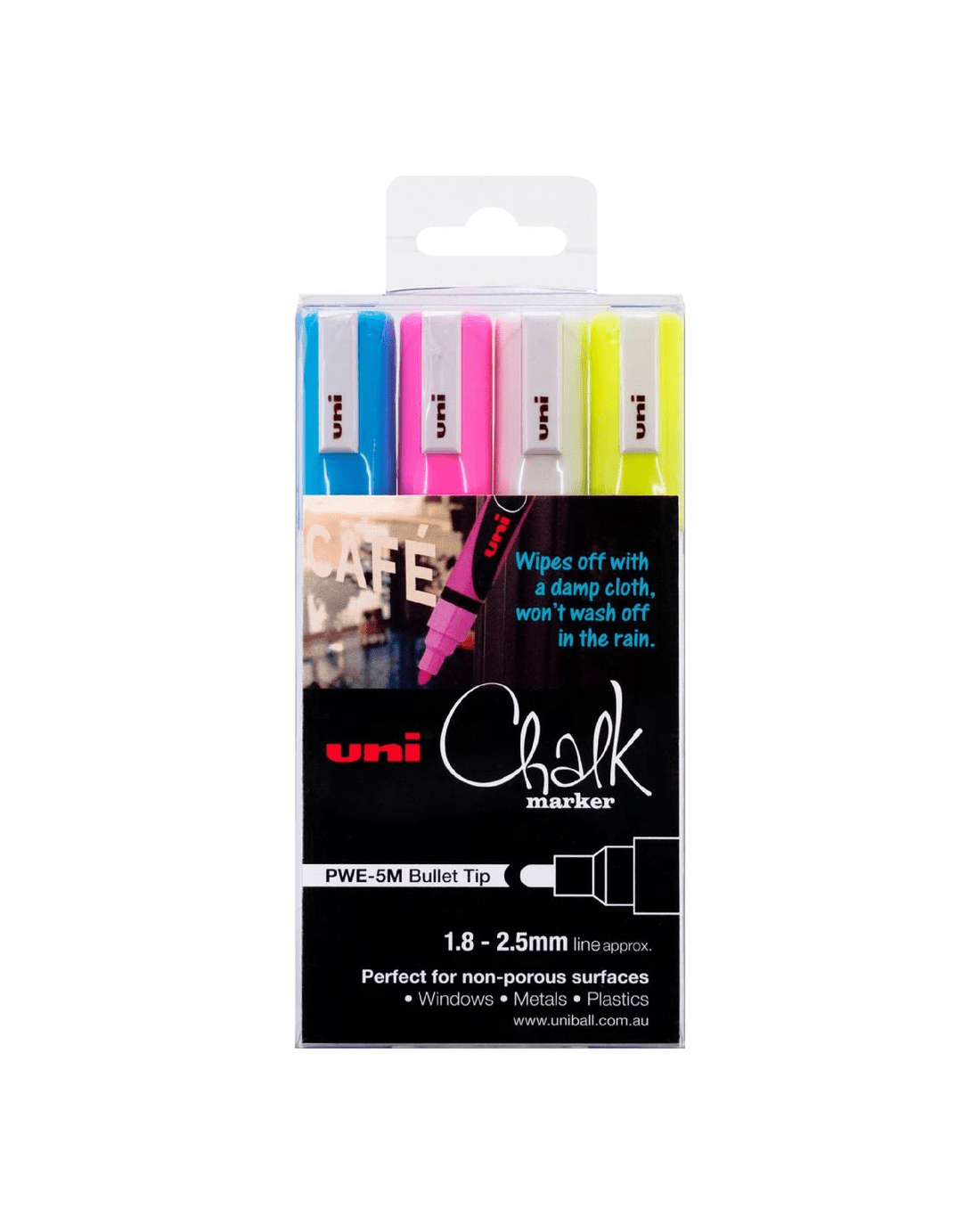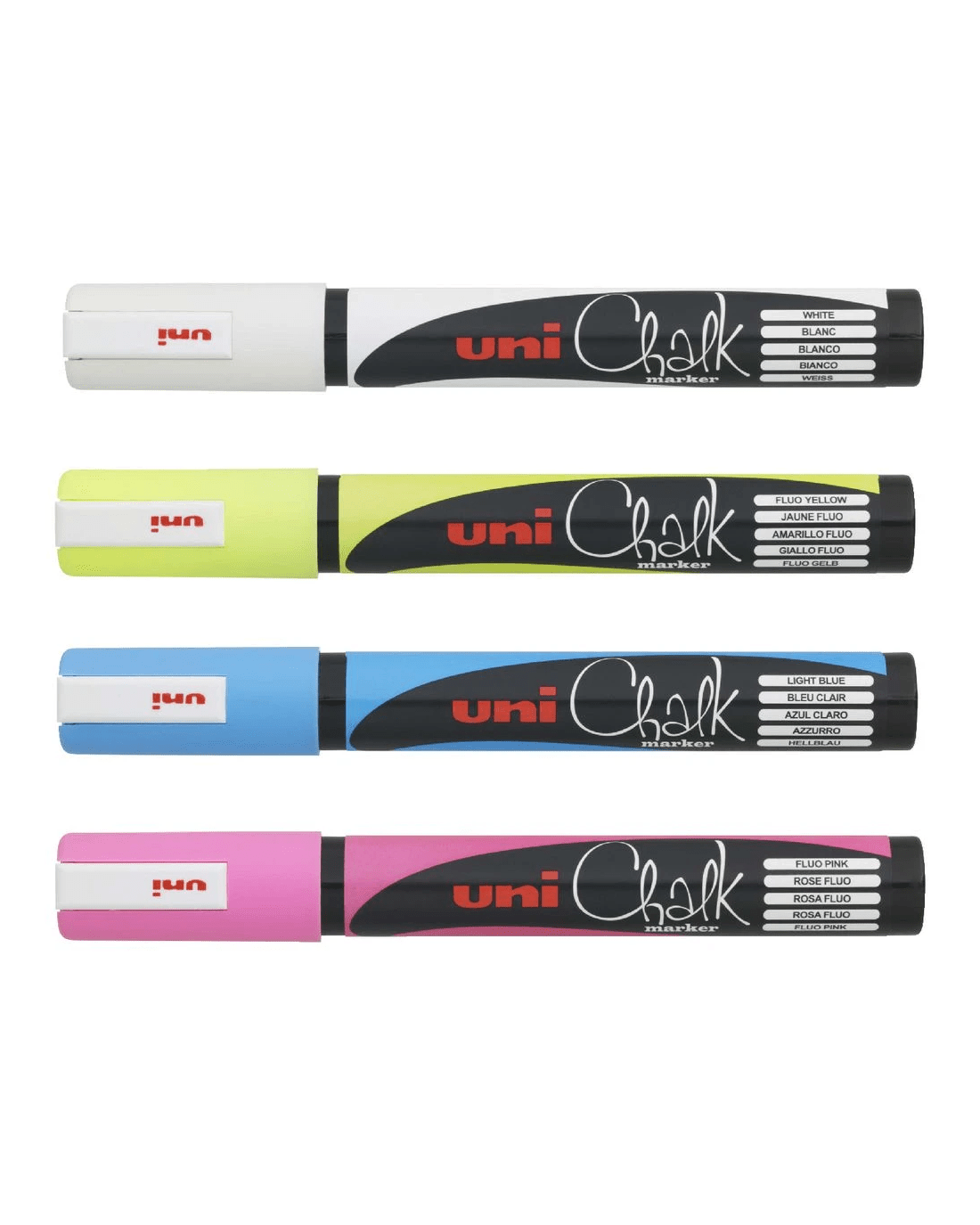 Uni Liquid Chalk Markers utilise water-based pigment ink so you can mark on windows, glass, mirrors, plastic and metal surfaces with ease. The ink won’t wash off in the rain, yet is easy to remove with a damp cloth. For permanent application the markers can also be used on chalkboards for a bold statement.
