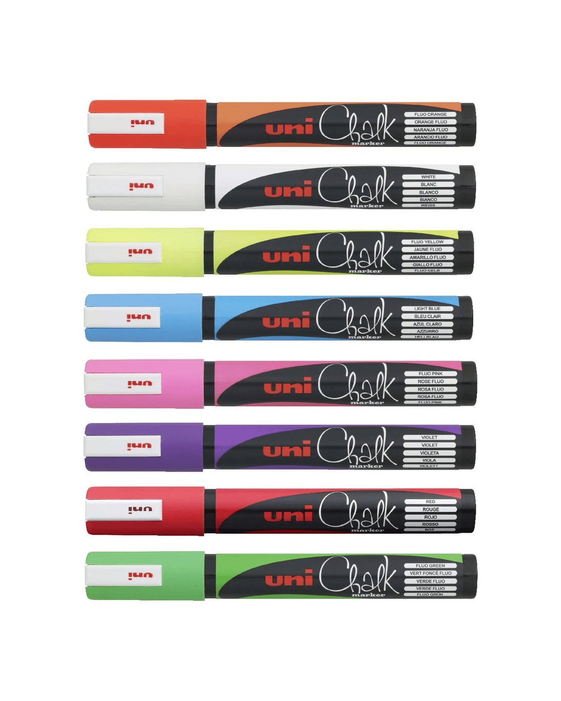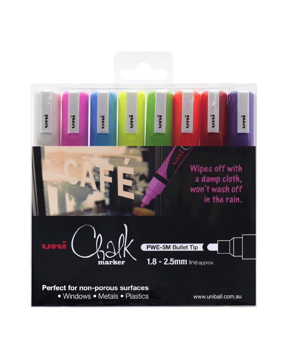 Uni Liquid Chalk Markers utilise water-based pigment ink so you can mark on windows, glass, mirrors, plastic and metal surfaces with ease. The ink won’t wash off in the rain, yet is easy to remove with a damp cloth. For permanent application the markers can also be used on chalkboards for a bold statement.