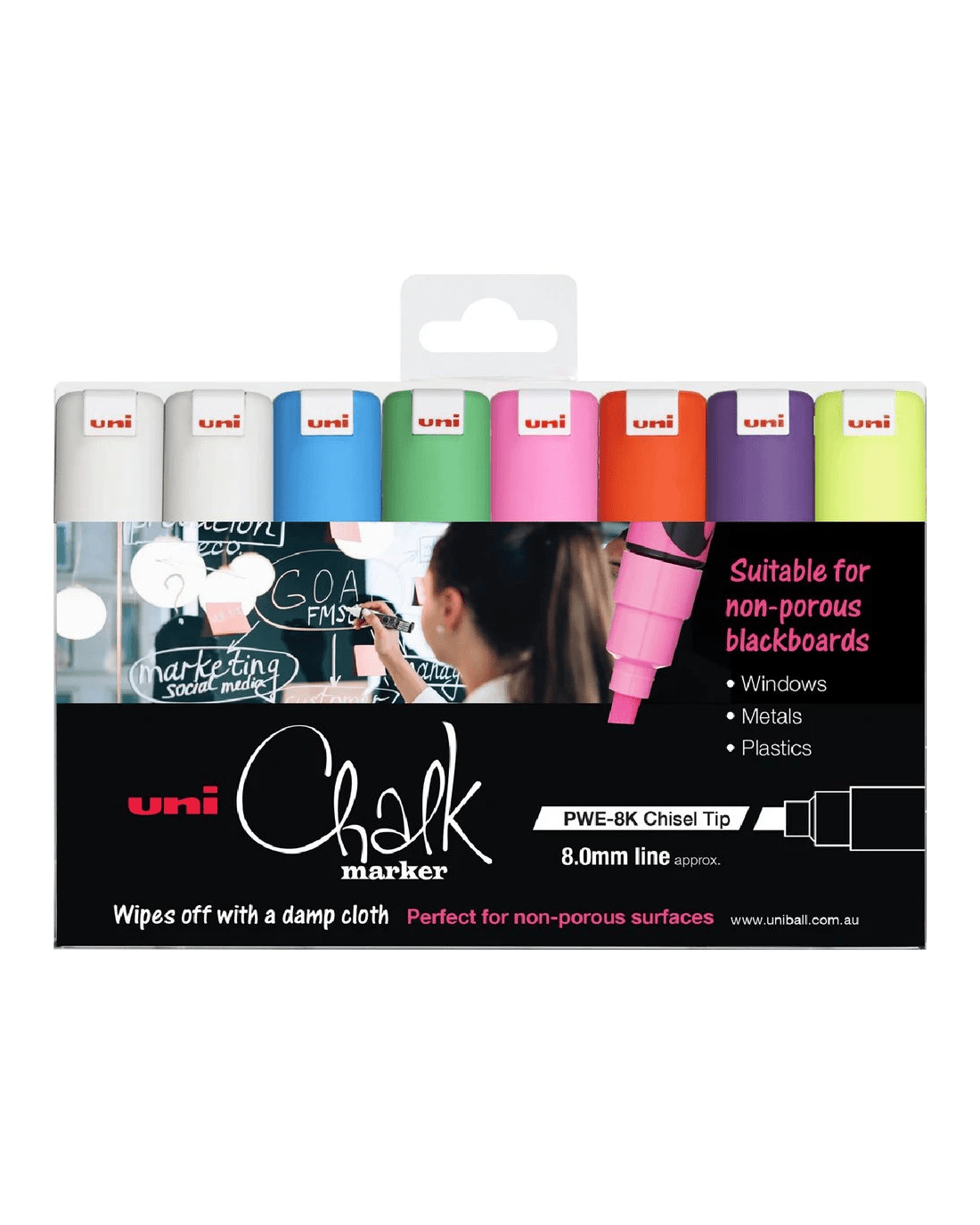 Sold by OfficeworksUni Liquid Chalk Markers Chisel Fluoro Assorted 8 Pack