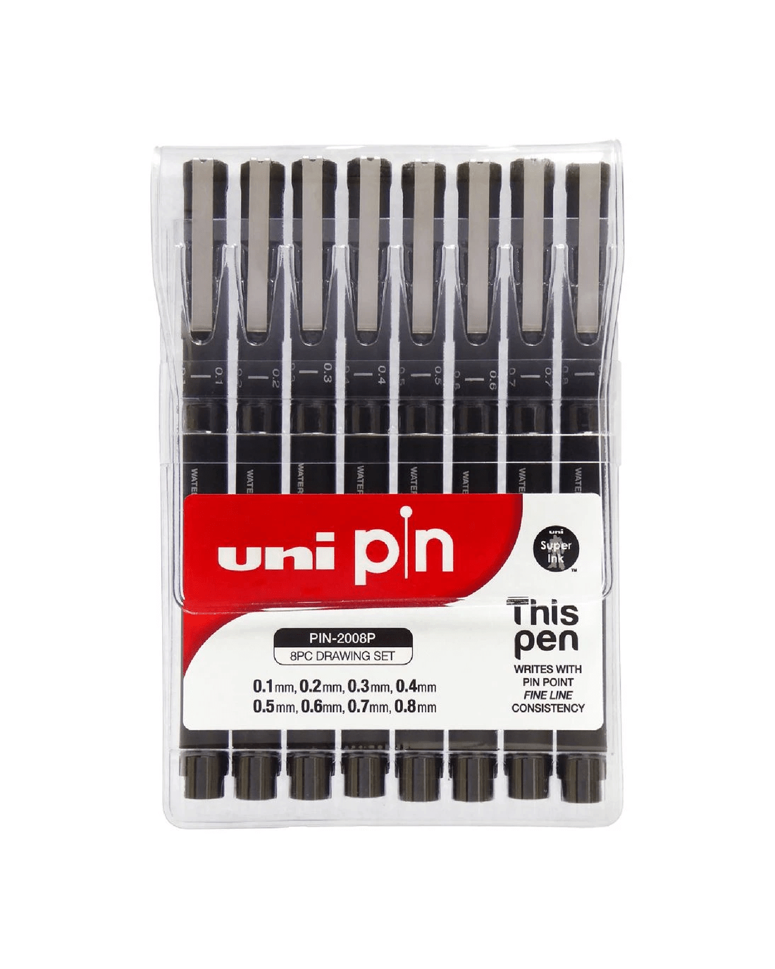 These Uni Pin Fineliners are perfect for drawing and drafting thanks to the Uni Super Ink which is permanent, waterproof and fade proof. These markers write super fine lines from a strong tip which will last a long time without spreading. The fineliners have a window cap which displays the point width so you can easily find the liner you are looking for.