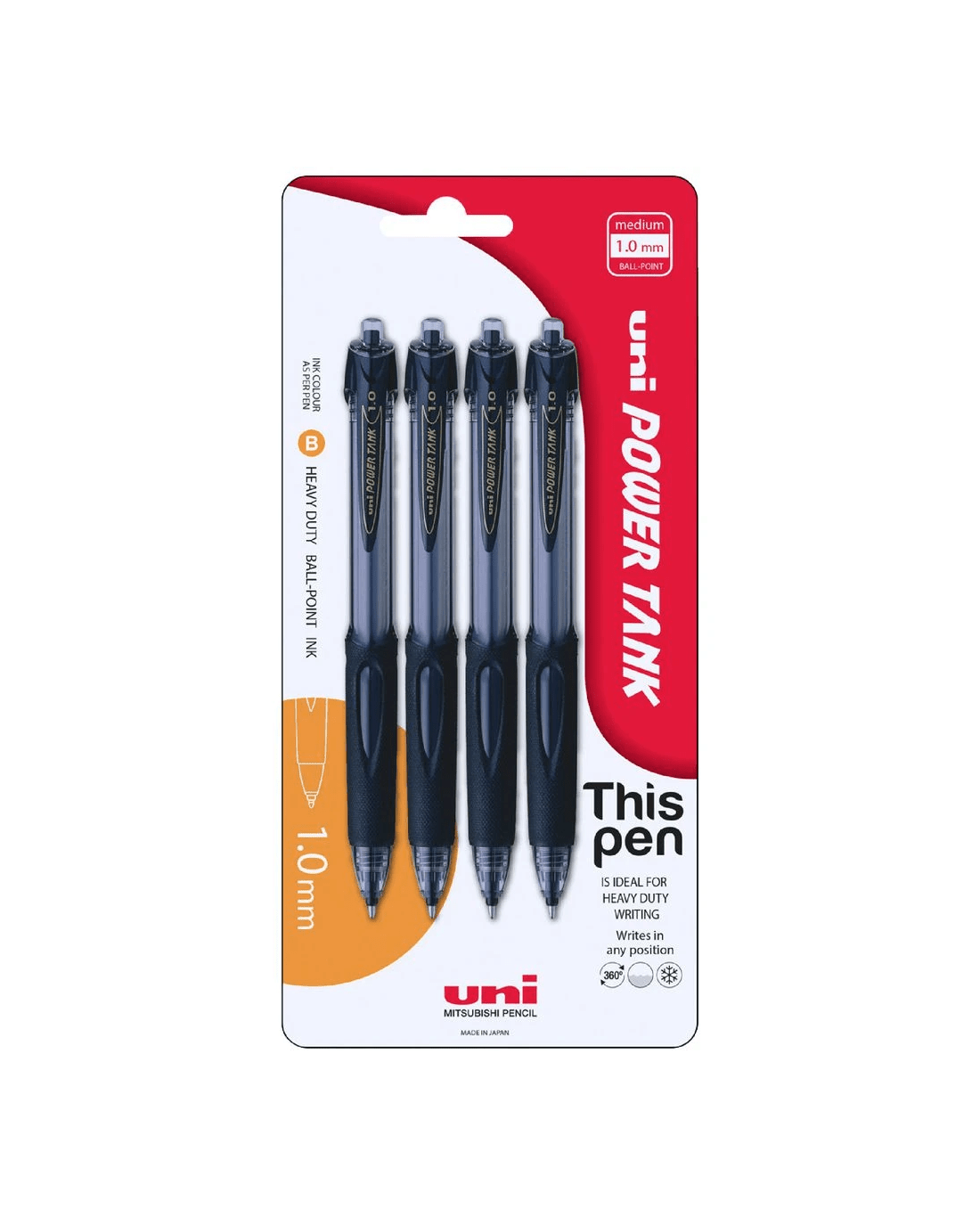 The Uni Power Tank Retractable Ballpoint Pen is the perfect pen for anyone who is constantly on the go. Thanks to its pressurised ink delivery system, this pen will write upside down, in extreme cold, on shiny surfaces and wet paper or even underwater. The elastic rubber grip will let you write clearly and comfortably in any position.