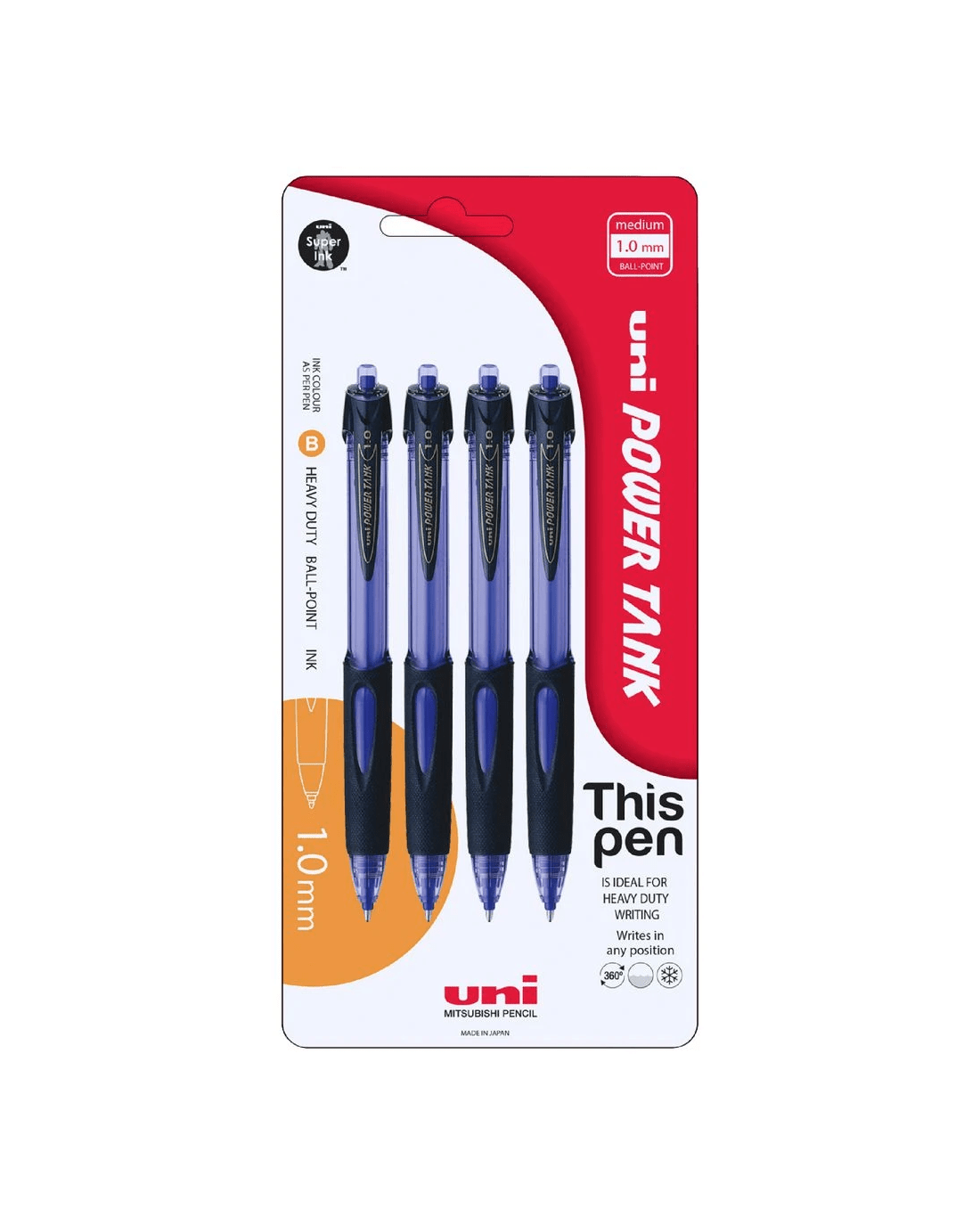 The Uni Power Tank Retractable Ballpoint Pen is the perfect pen for anyone who is constantly on the go. Thanks to its pressurised ink delivery system, this pen will write upside down, in extreme cold, on shiny surfaces and wet paper or even underwater. The elastic rubber grip will let you write clearly and comfortably in any position.