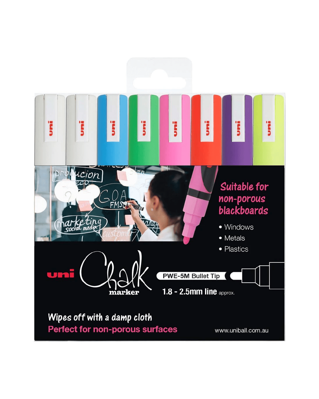 Sold by OfficeworksUniball Bullet Liquid Chalk Markers Fluoro Assorted 8 Pack