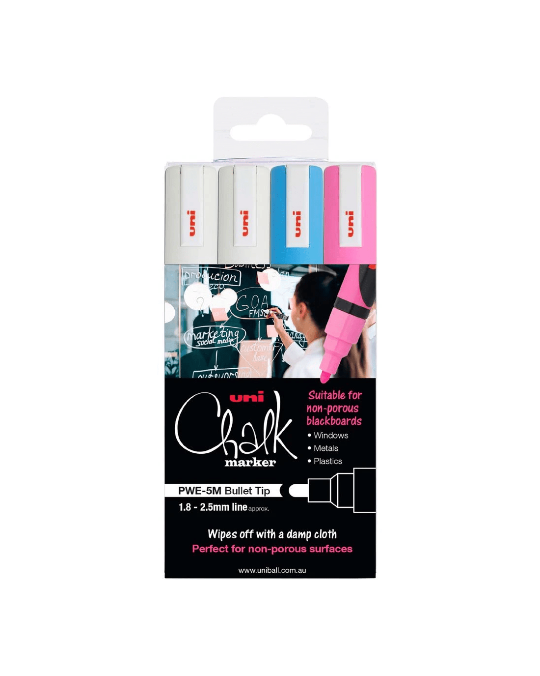 Uniball Bullet Liquid Chalk Markers White/Blue/Pink 4 Pack
