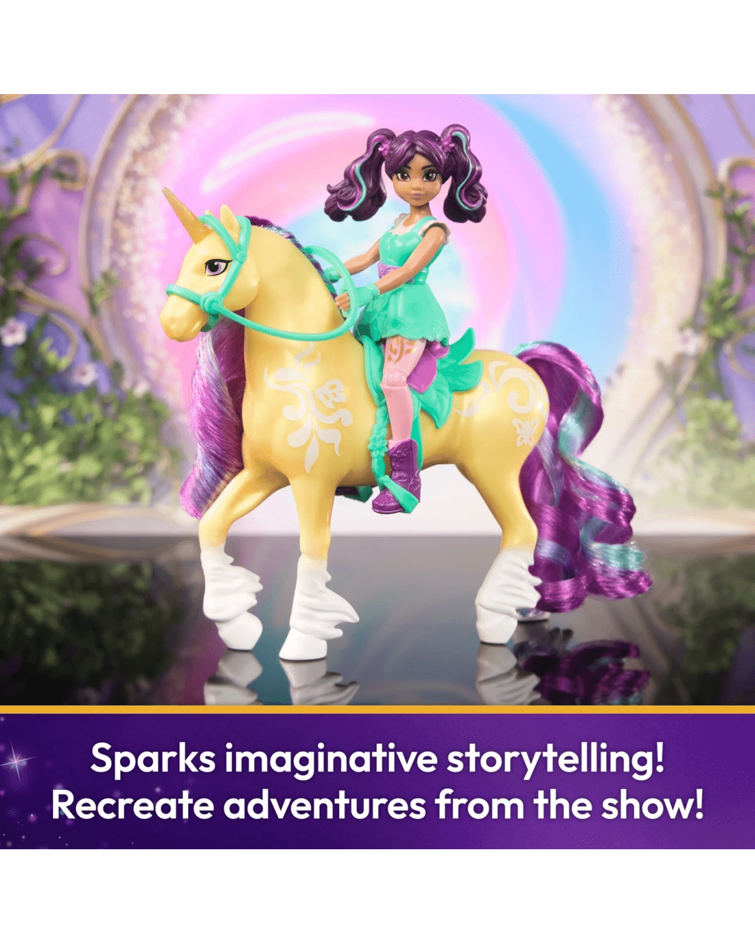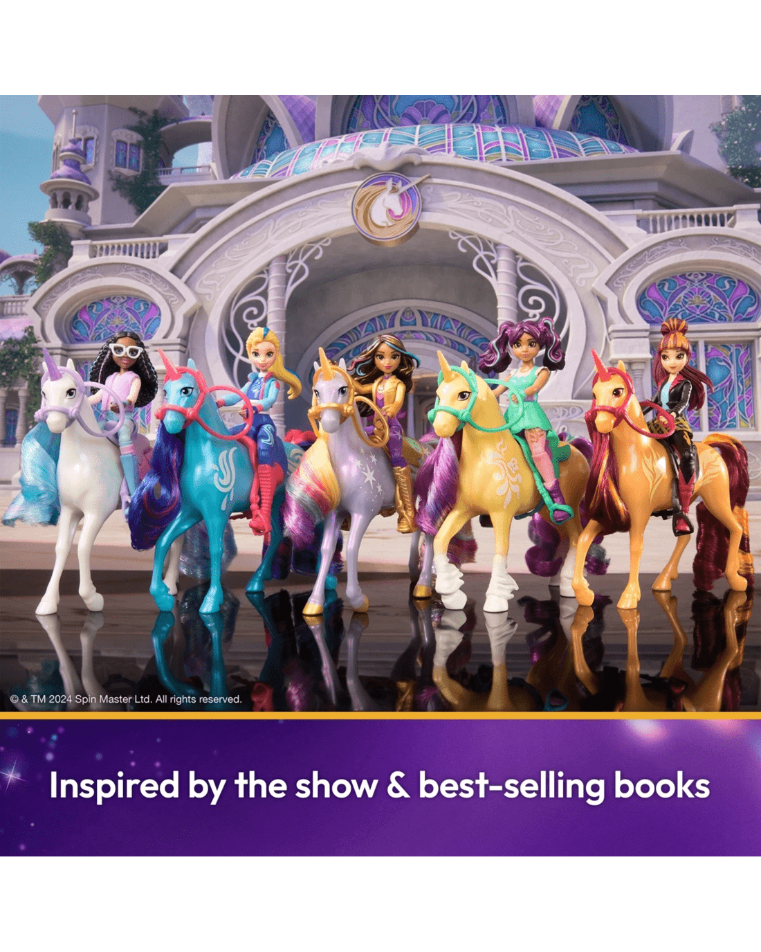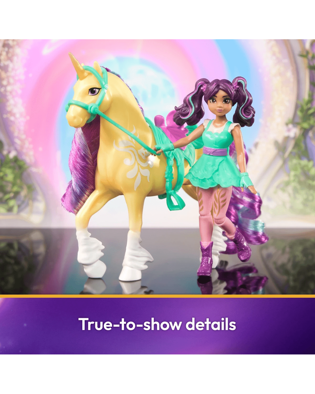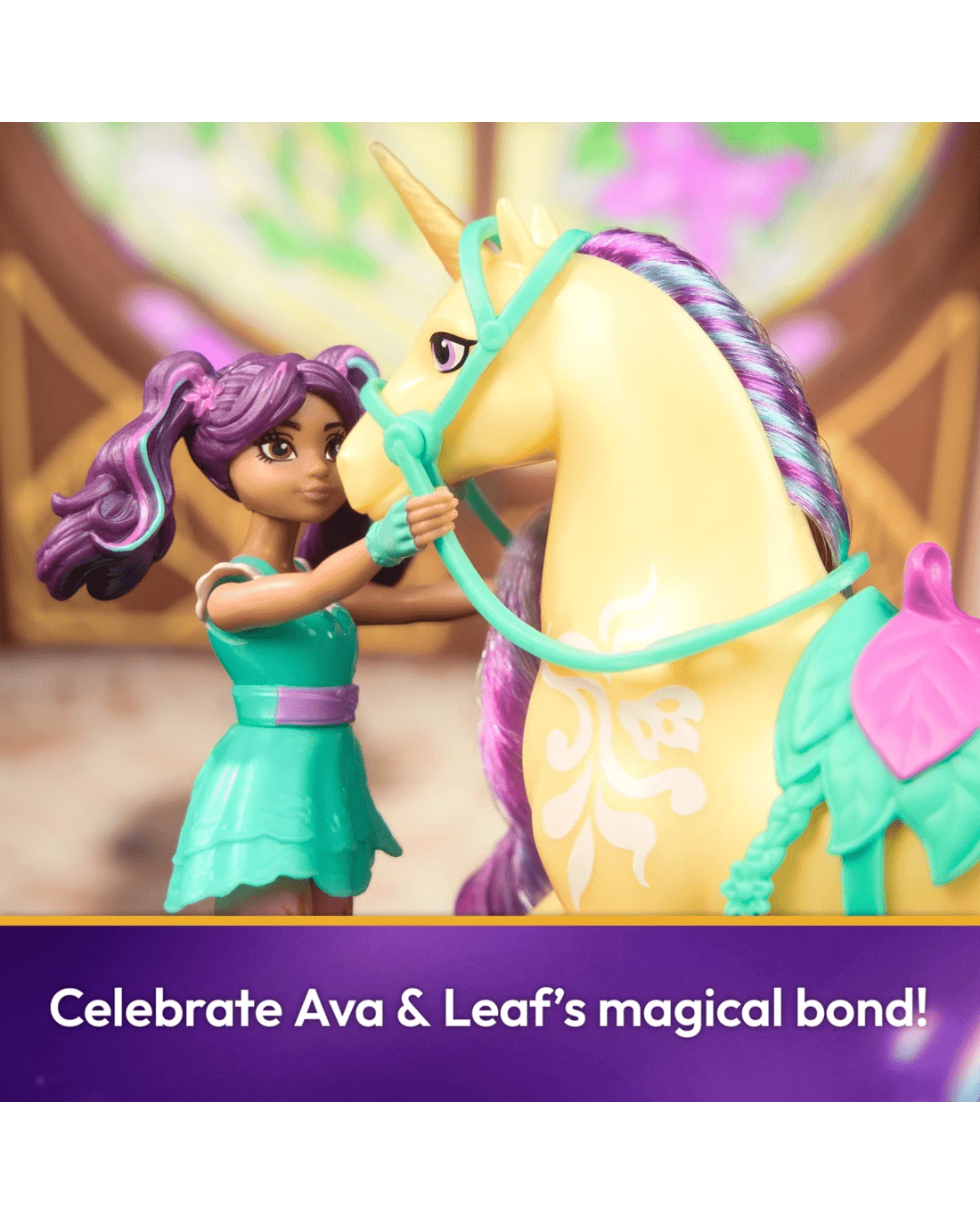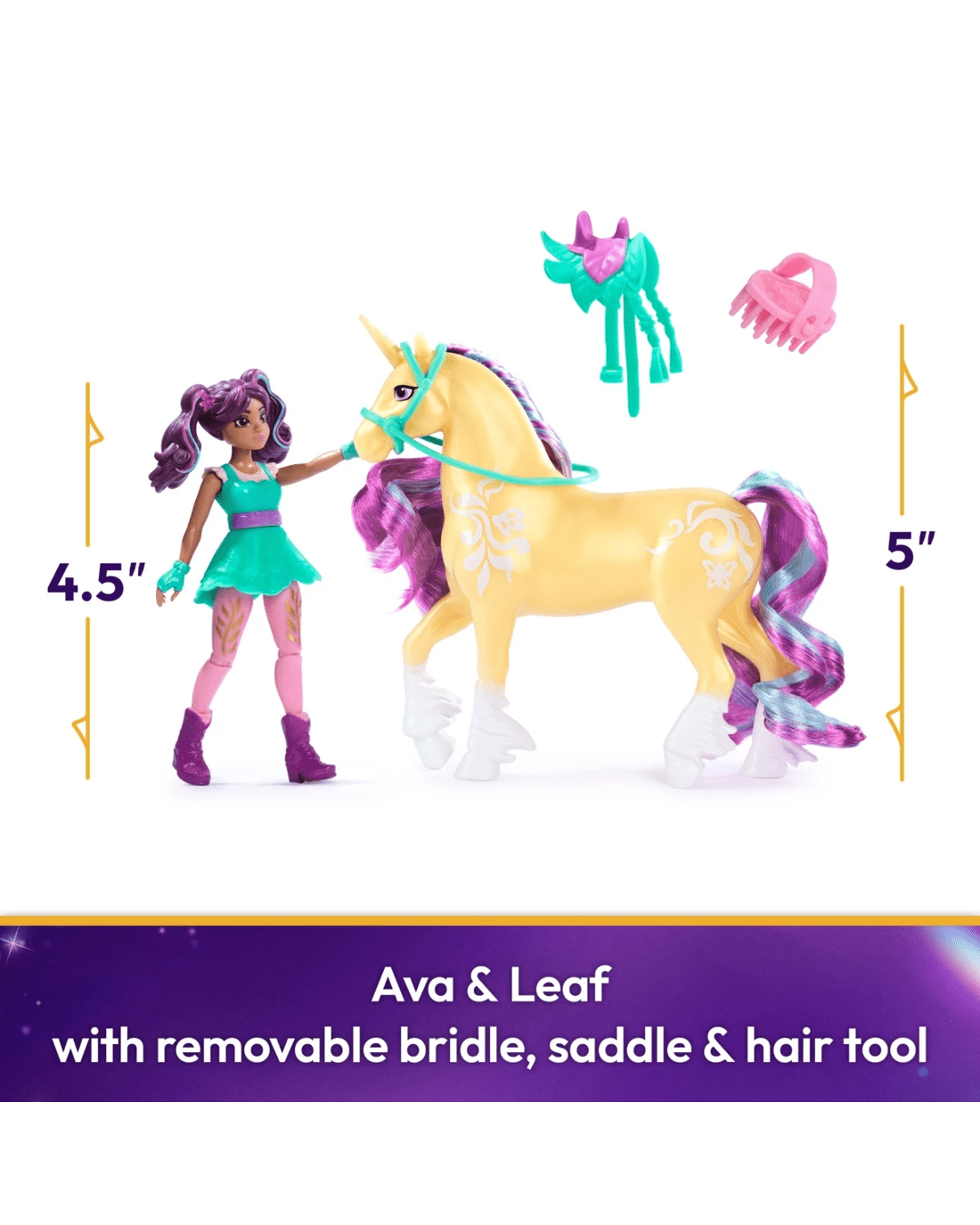 Celebrate the bond between rider and unicorn with the Unicorn Academy Ava & Leaf Set! Inspired by the Netflix animated show and best-selling book series where friendship reins, this set will spark endless imaginative storytelling. The 11cm Ava features realistic true-to-show details and seven points of articulation for dynamic poses. Leaf stands at 13cm tall, complimenting Ava's look with Plant Magic markings and brushable purple and teal mane and tail (brush included). As you play, pose Ava to sit on Leaf and ride into adventure! With the removable bridle and saddle accessories, Ava can securely stay in place on Leaf. For more ways to experience Unicorn Academy with your favourite characters, look for the other small dolls, including Sophia, Layla, Isabel, Valentina, and their unicorns (sets sold separately) and expand your world! For kids who enjoy unicorns and horse toys, dolls and accessories, doll house play, collectibles, plush toys and more, Unicorn Academy toys are fun birthday gifts for girls or gifts for any occasion. Experience enchanting Unicorn Academy adventures with the Ava & Leaf Set!