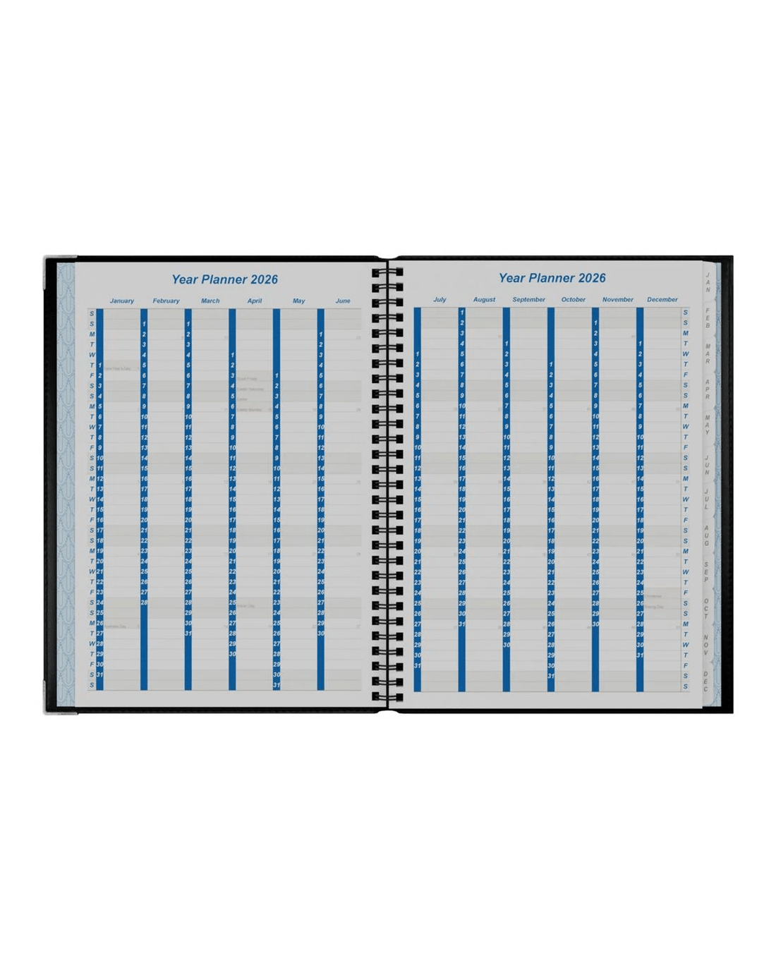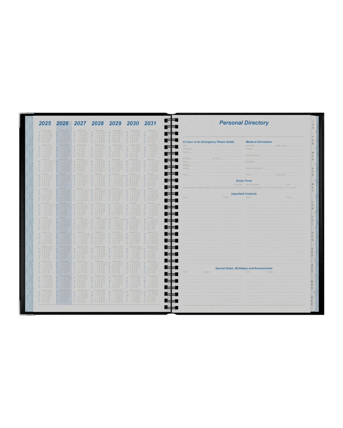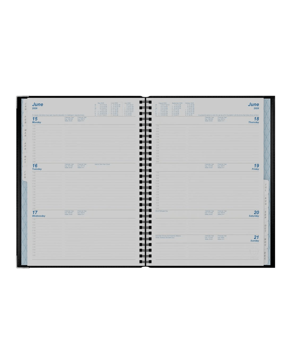- The diary features Wire-O binding, monthly tabs, and 2 page ribbons.