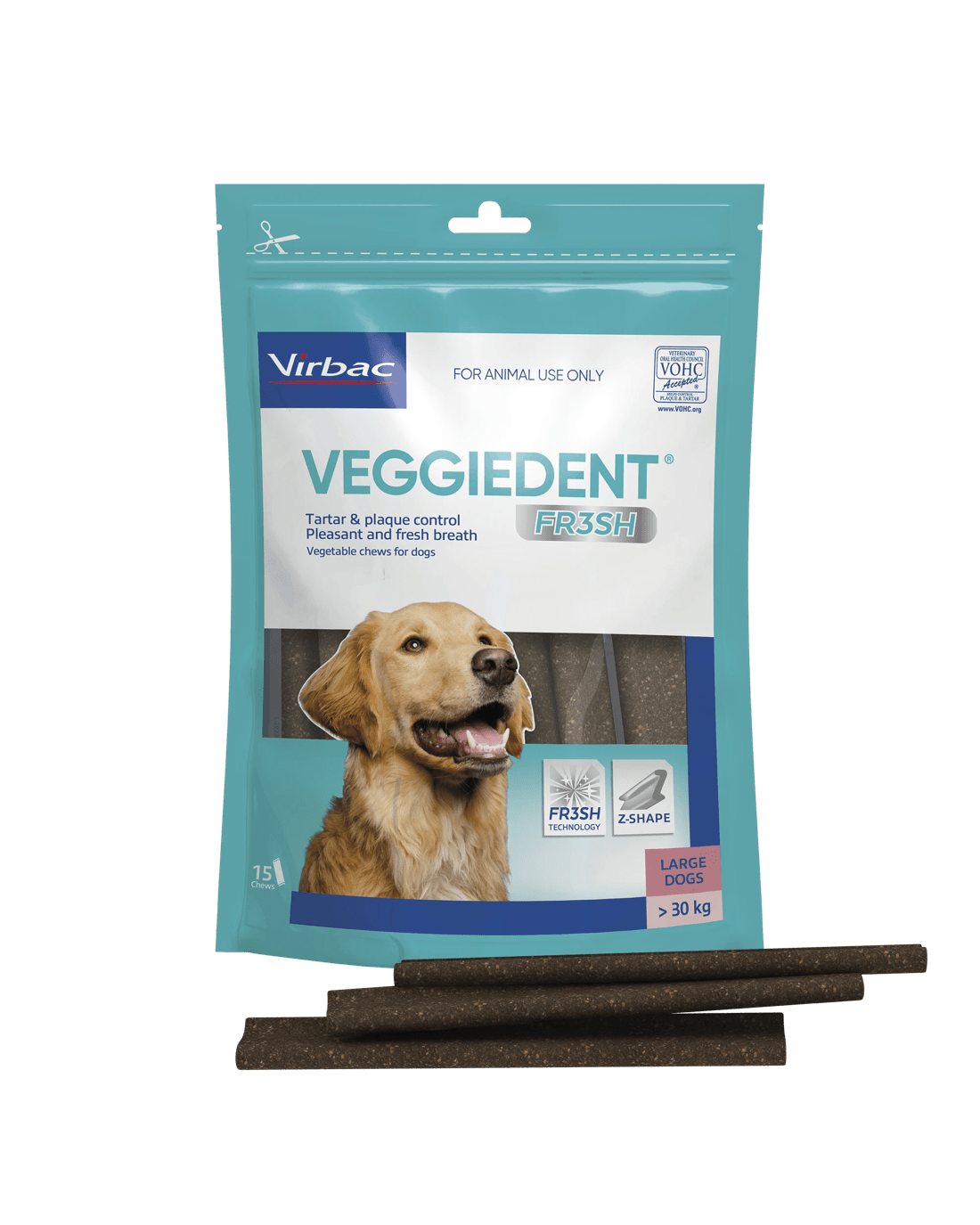 VEGGIEDENT FR3SH Dental Chews help control plaque and tartar while keeping your dog’s breath fresh. With a great taste dogs love, these plant-based chews are both effective and enjoyable.