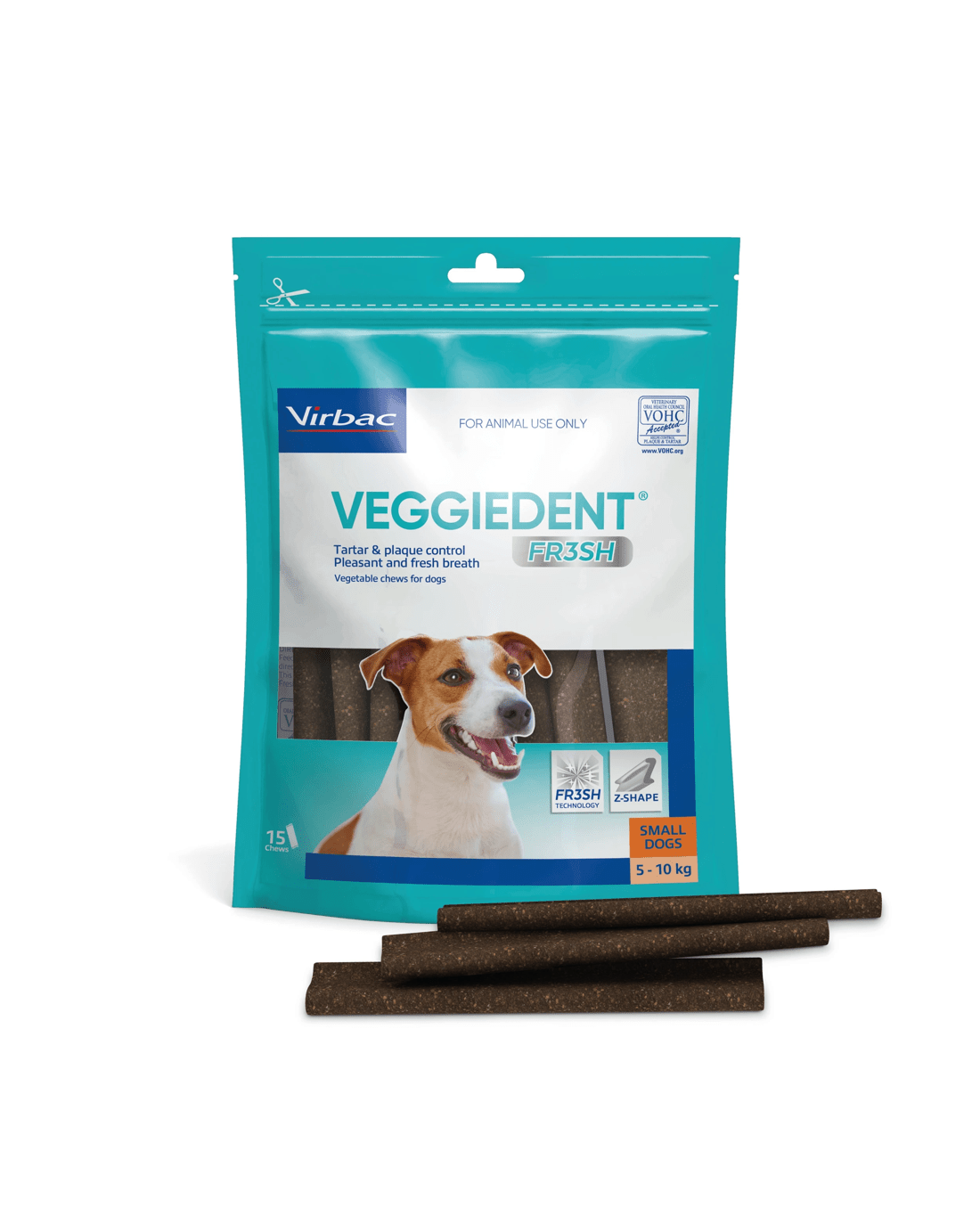 VEGGIEDENT FR3SH offers an all-in-one dental care solution that cleans teeth, freshens breath, and supports healthy digestion — all in a tasty chew your dog will love.