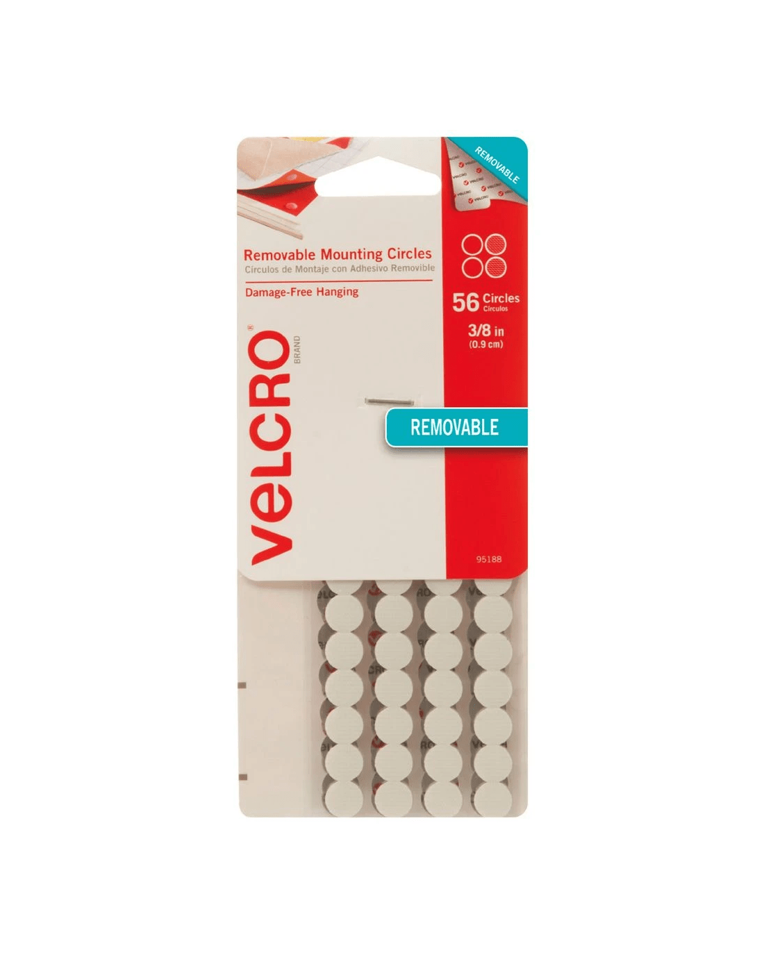 VELCRO Removable Circles are a convenient way of quickly mounting posters, signs, cables and displays around the home or office. This pack comes with 56 self-adhesive dots that are 9 mm in diameter and will adhere to most surfaces.