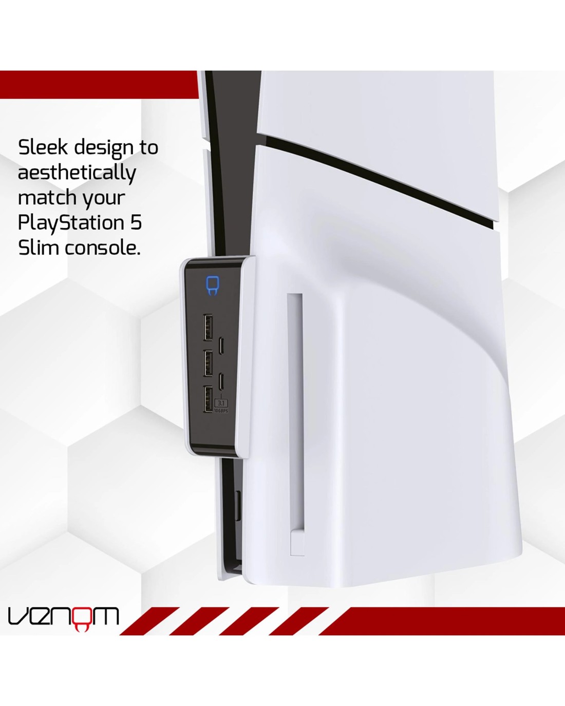 Expand your PlayStation 5 Slim USB connection with our innovative 5-port USB hub. The sleek design simply clips into the front port of your console to offer 3 x USB 2.0 outputs and 2 x USB type C. The USB hub allows multiple devices to be connected to your console at the same time allowing you to charge extra controllers, plug in a wired gaming microphone or connect your mobile phone all from the front port of your console. Please note: Data transfer is only possible via the USB Type C port marked 3.1, the other 4 ports are for charging only and cannot be used to transfer data.Features