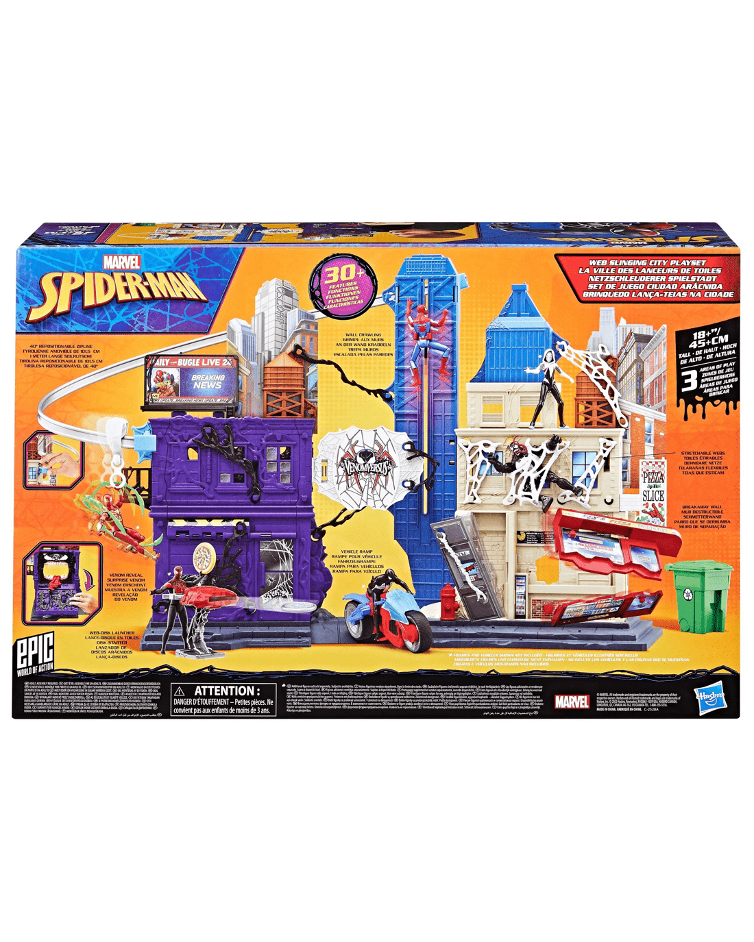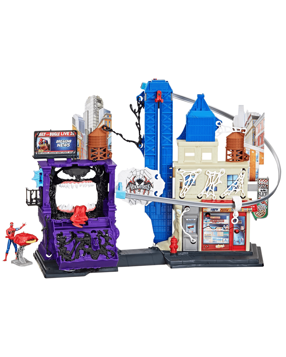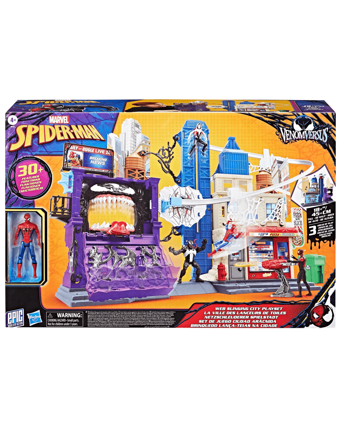 - Symbiote surprise: Flip down the façade on the front of this Spidey playset to reveal a menacing Venom face with symbiote chomping action, for gobbling up 4-inch Epic World of Action figures