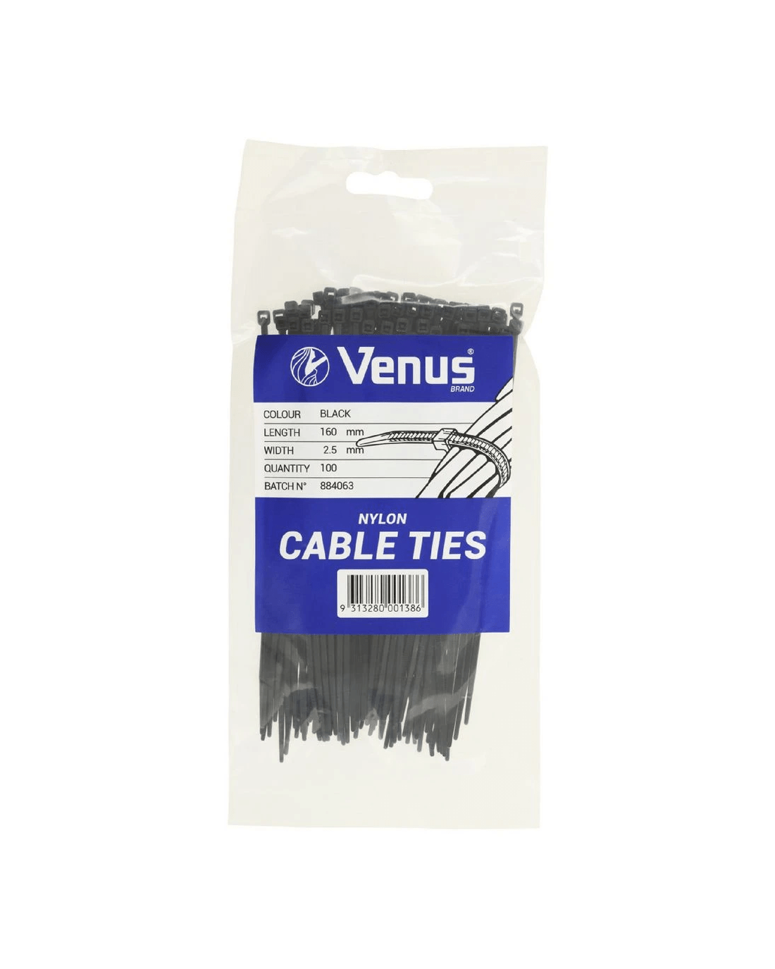Sold by OfficeworksVenus Cable Ties 160 x 2.5 mm Black 100 Pack