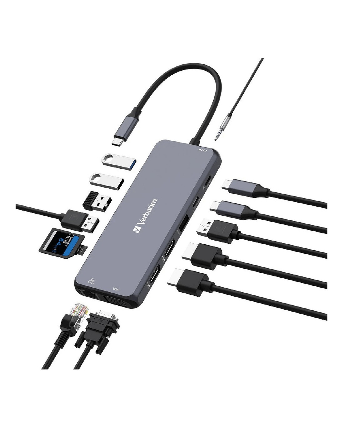- This hub contains the 14 following ports: 2 x HDMI, 1 x VGA, 1 x RJ45, 4 x USB-A 3.2, 2 x USB-A 2.0, 1 x SD. 1 x microSD, 1 x 3.5mm, and 1 x USB-C.