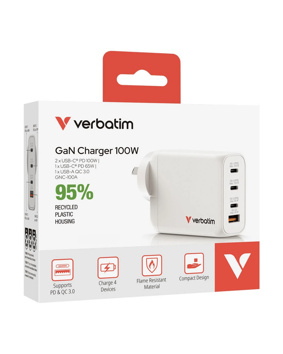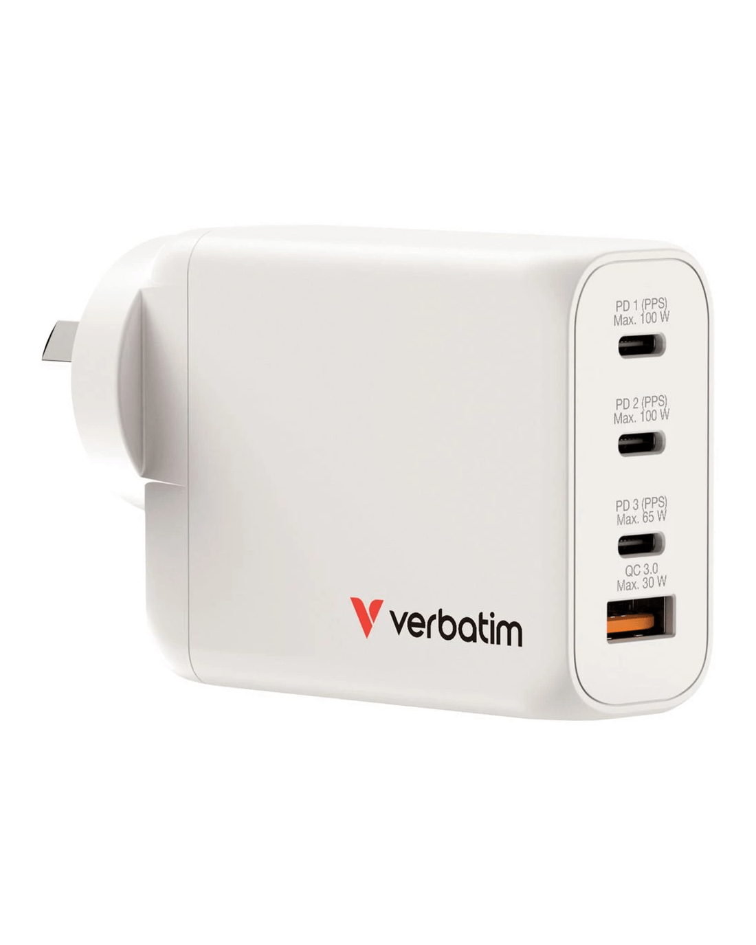 Sold by OfficeworksVerbatim GaN Wall Charger 3 x USB-C 1 x USB-A 100W White