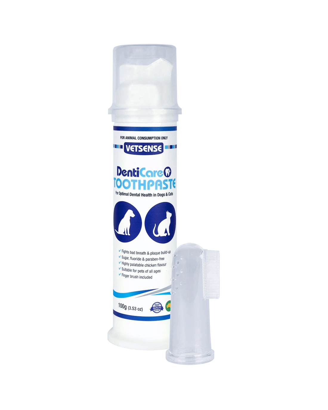 DentiCare Toothpaste Kit for optimal dental health in dogs and cats helps fight bad breath and plaque build-up while preventing dental disease. This professionally formulated toothpaste is sugar, fluoride, and paraben-free, with a highly palatable chicken flavor suitable for pets of all ages.