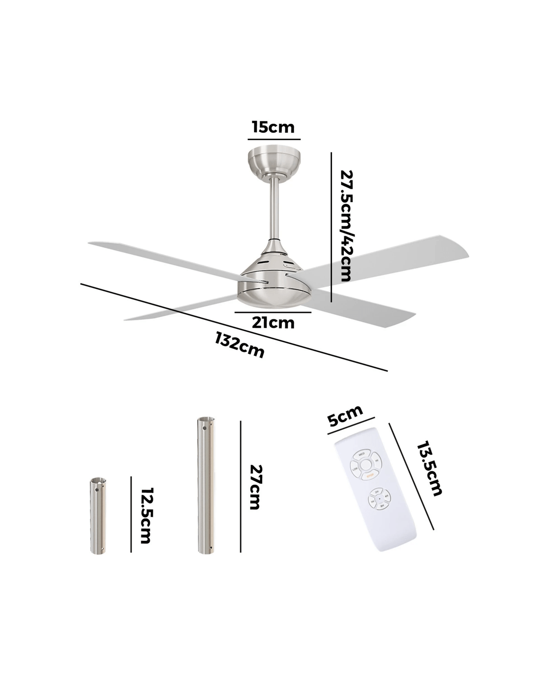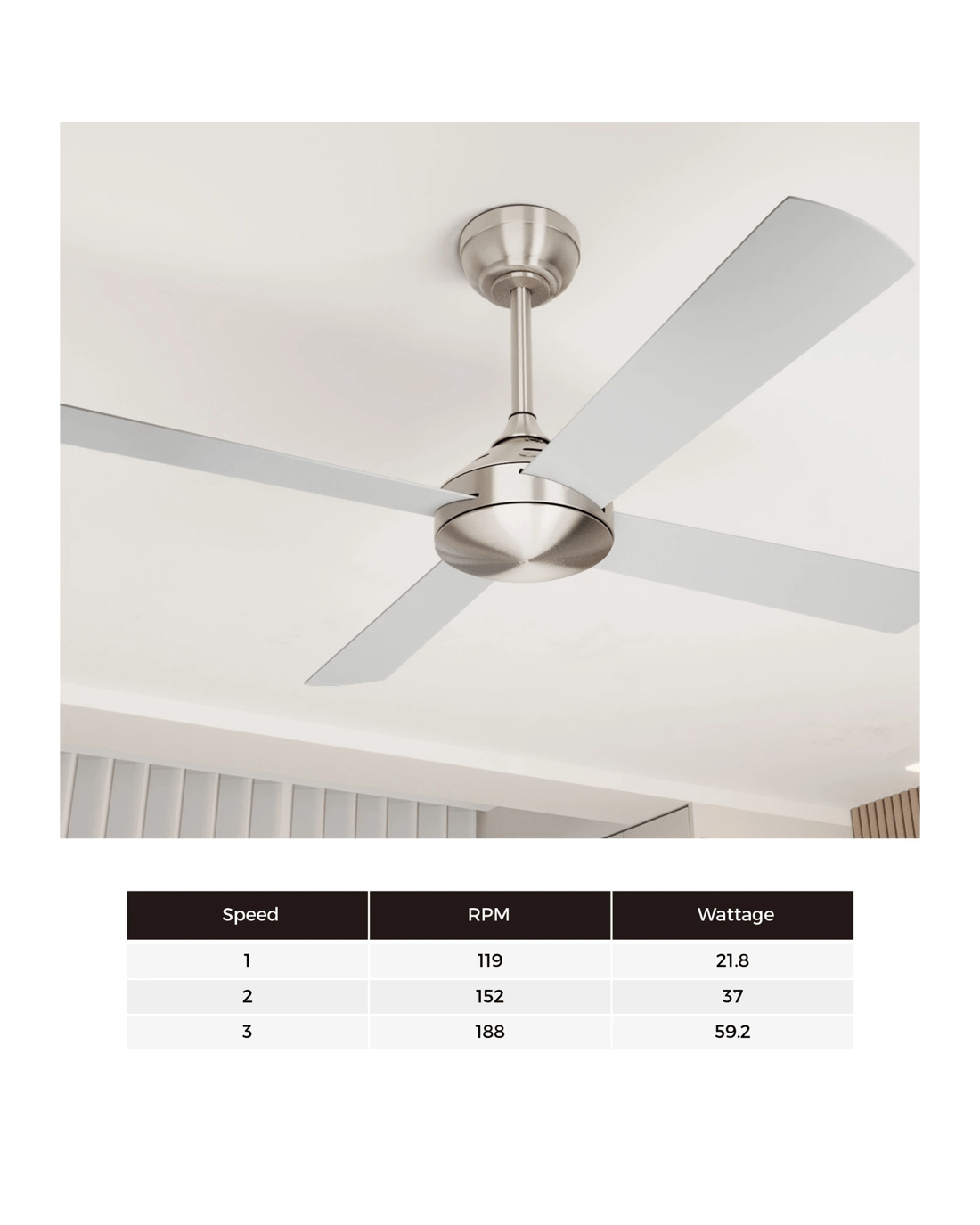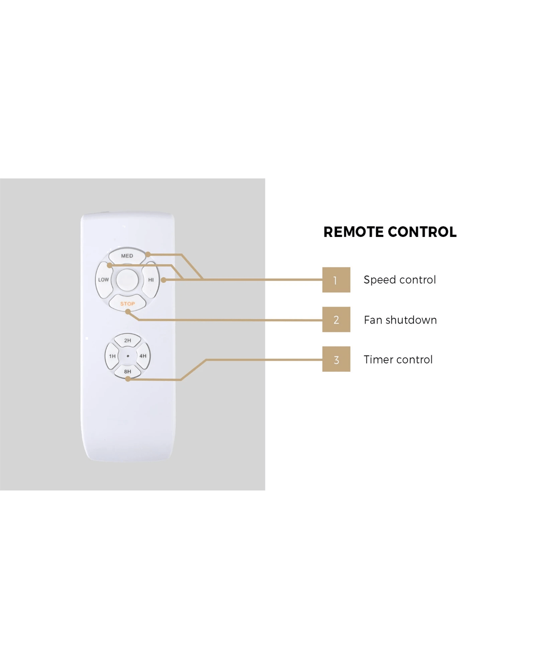 Operational-wise, the ceiling is powered by an efficient and quiet 70W AC motor with four 52"(132cm) plywood blades rotating at a choice of up to 3 speed levels. All these and more conveniently controlled by the handy remote control by your side as you work, rest, relax and chill under the fan's pleasant drafts. Better still, you can set the timer for up to 8 hours so that it can do its fanning at your preferred times of the day or night.