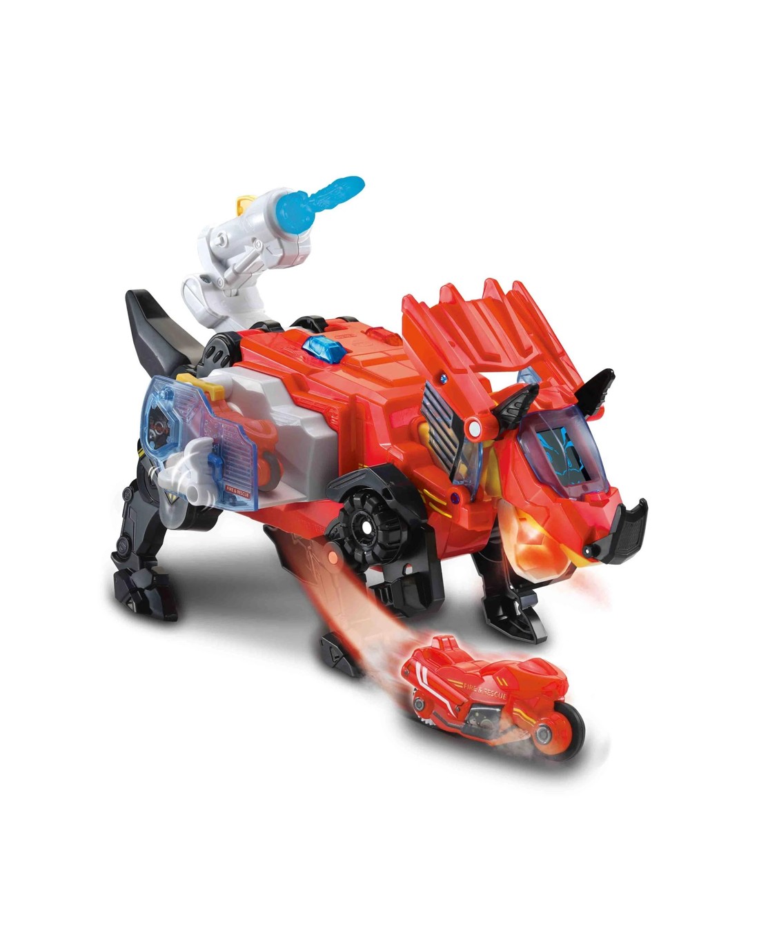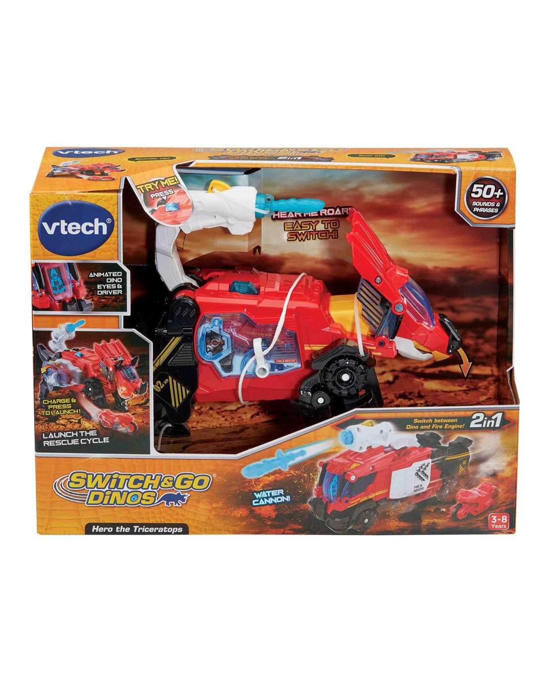 Roll out with Switch & Go Dinos Hero the Triceratops! Easily switch this mighty Triceratops into a heroic blazing-fast fire engine that features lights, fun phrases, cool sound effects and an animated firefighter. Activate the water cannon to launch the water projectile to get flames under control! Let's see what this engine can do! And in a few simple steps, switch this fire engine back into a dino with cool animated eyes and roaring sounds, facts and phrases. Where there's smoke there's fire! Launch the rescue cycle to scout ahead, then help Hero stomp out the fire. Let's Switch & Go! Ages 3 +
