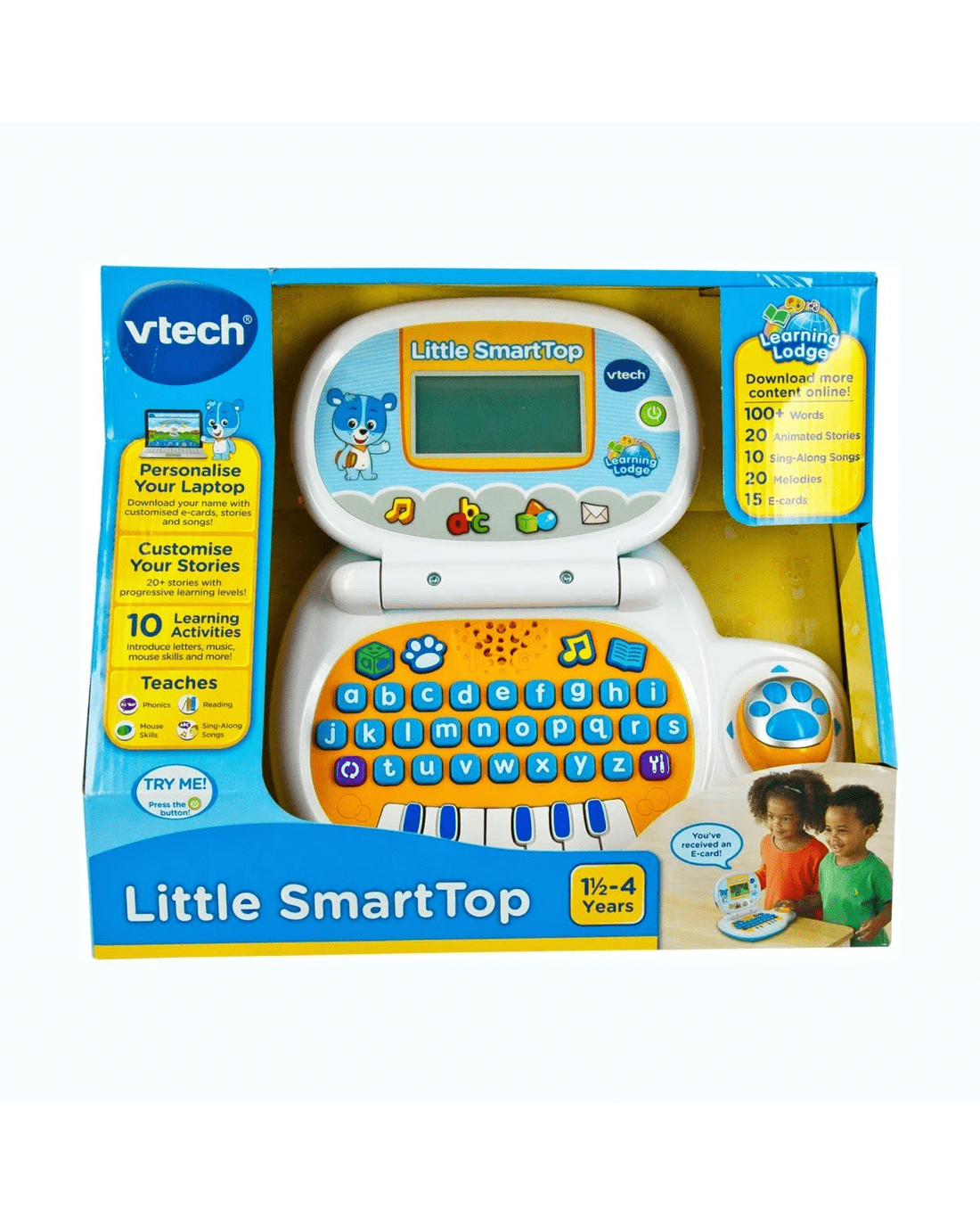An exciting, small and portable role play laptop with a cute bear character introducing fun learning to kids! With an A-Z keyboard, kids can press a letter to learn the letter sound, name and hear an object name relating to the letter they have pressed! Features 10 fun activities that will help them discover shapes, numbers and instrument sounds! Kids will receive virtual E-cards from friends and family to listen to stories read by the cute bear character; there is much for your little one to love while playing on their Little SmartTop!