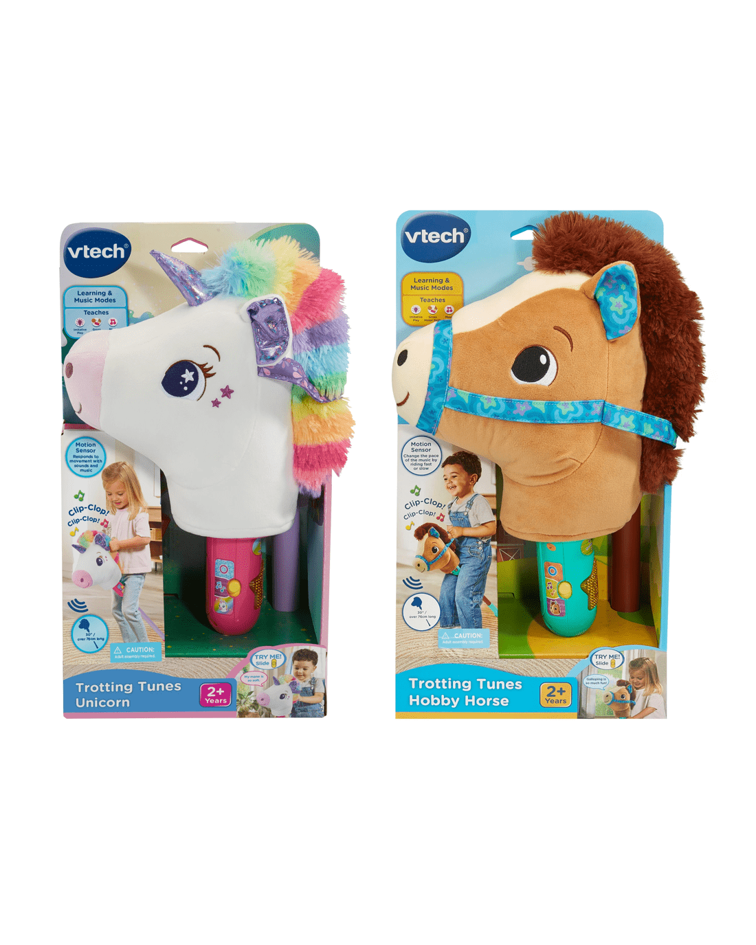 Saddle up and go for a ride on the adorable VTech Trotting Tunes Hobby Horse or Unicorn. Rock and ride to Music and Learning modes that play songs and introduce facts about the friendly horse or unicorn. Change the pace and the music tempo too! Walk the horse or unicorn around to play the songs slowly or giddy up and gallop to play the music faster. Press the light-up star to hear pretend-play phrases and to change the music. Let's go! This 76cm long hobby horse and unicorn are easy to assemble. Connect the horse or unicorn to the riding stick with a click and trot off into the sunset.