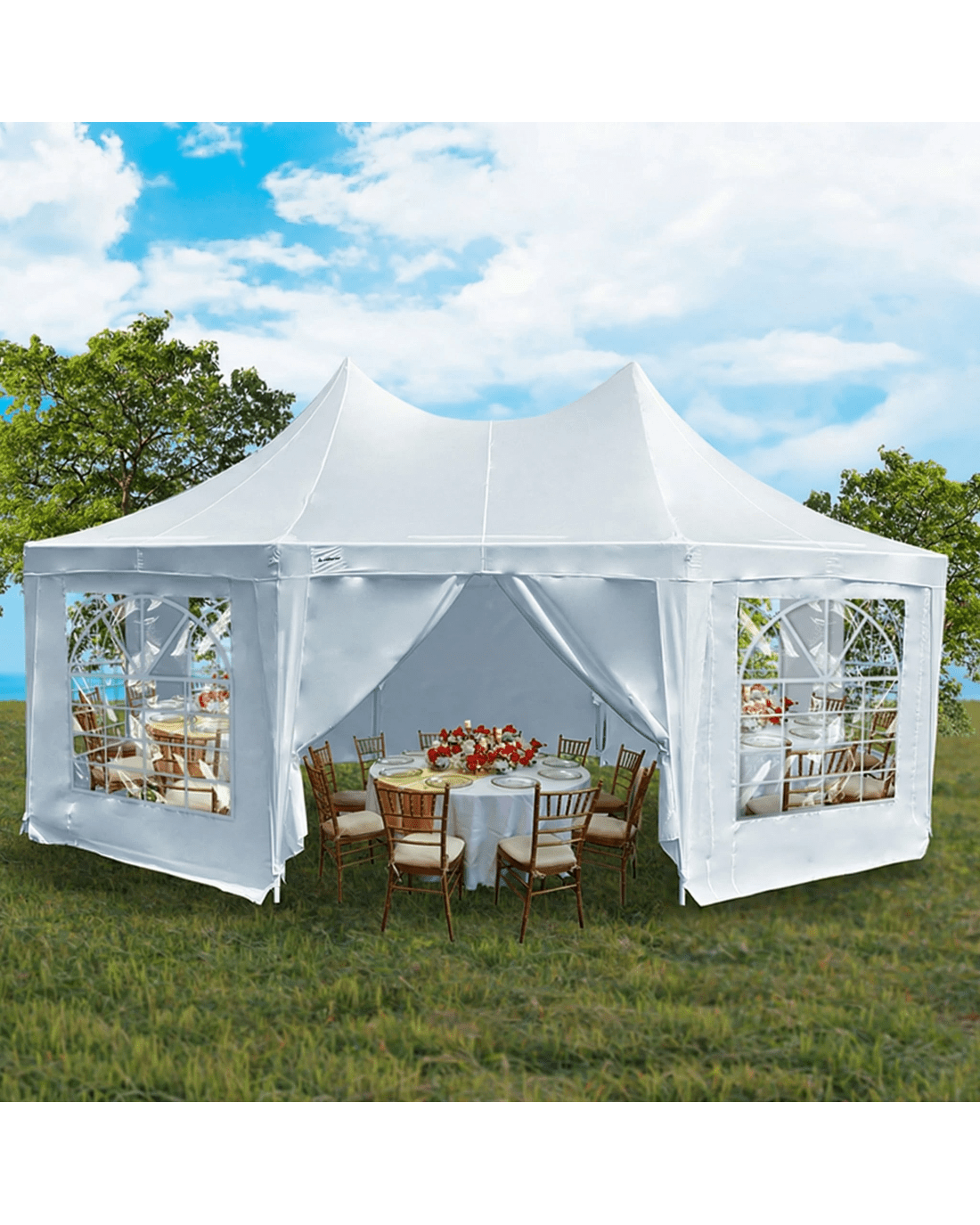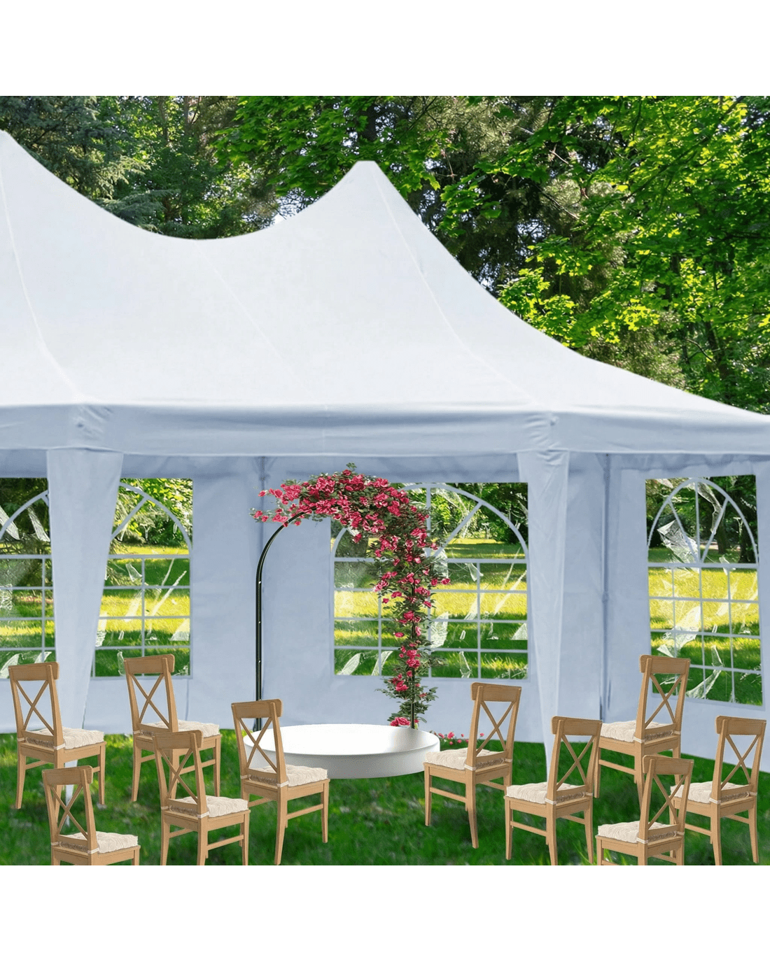 The Wallaroo Wedding Gazebo is designed to withstand mild weather conditions with ease. The frame is made with rust-resistant, corrosion-resistant steel, while the walls and roof are made from heavy-duty PVC.