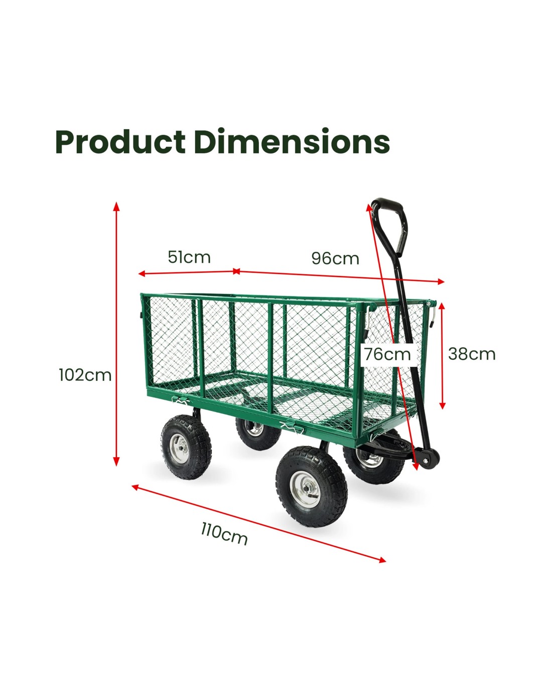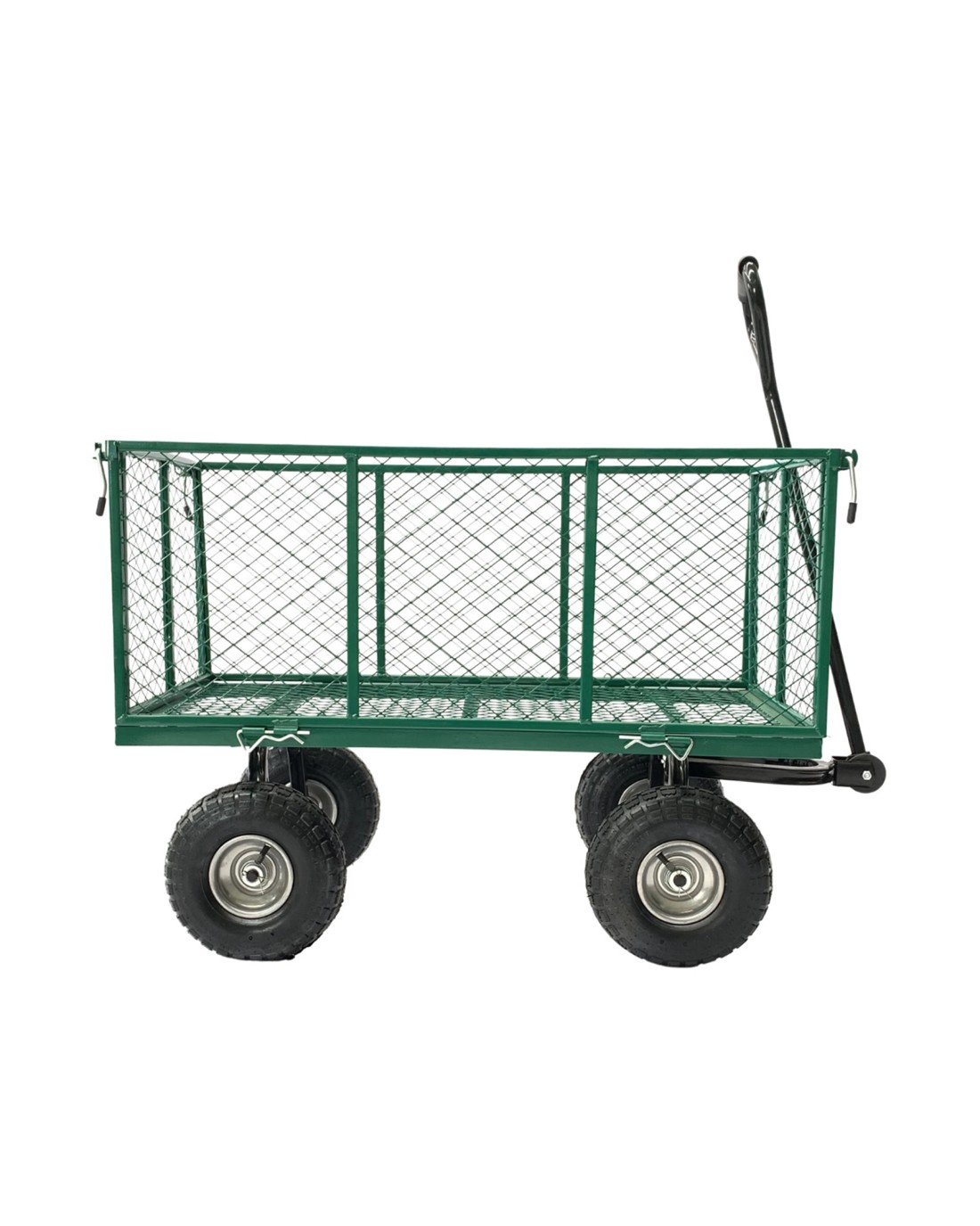 The heavy-gauge steel mesh sides can be folded down or removed, allowing you to use the cart as a flatbed trolley. Now you can easily haul wider loads such as tiles, slabs and pallets. The garden cart also uses rack and pinion steering, which means tight turns are no problem. And the padded handle is comfortable to pull, even when the cart is fully loaded.