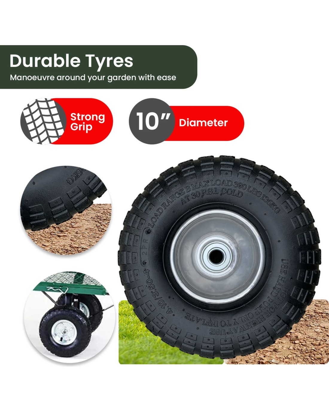 This heavy-duty garden cart makes landscaping jobs so much easier! It has a 300kg max loading capacity and 10-inch pneumatic tyres that can navigate your garden, yard and driveway with ease.