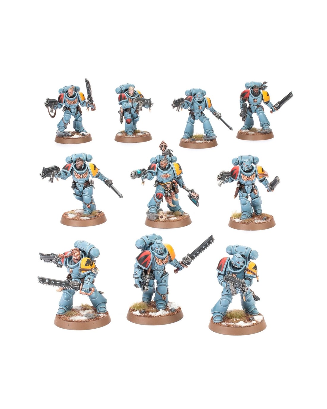 Grey Hunters are patient, cunning, and adaptable - their instinctive raw aggression tempered, but never quashed, by countless battlefield victories. Some packs take and hold ground, unleashing volleys of disciplined firepower, while others stalk the flanks, ready to leap in for the kill. This multipart plastic kit builds 10 Grey Hunters, cunning infantry for your Space Wolves armies in games of Warhammer 40,000. Armed with bolt carbines, bolt pistols, and Astartes chainswords, they excel at medium to close range firefights, charging in to cut down whatever is left in melee. The kit includes parts to build an optional Pack Leader who can be armed with a bolt carbine or plasma pistol in one hand, and a chainsword, power sword, power axe, or power fist in the other. They have a choice of two heads, two backpack icons, and three shoulder pads - one featuring the sigil for Ragnar Blackmane's Great Company, one for Logan Grimnar's, and a blank one. Two members of the squad can be optionally built carrying their bolt carbines in both hands. There are 24 heads in the kit - 10 helmeted and 14 bare - and 26 shoulder pads, which are all interchangeable across the miniatures, as are the weapons. There is also a selection of pistol holsters, pouches, and knives to further personalise your relentless predators. This kit comprises 218 plastic components, 10x Citadel 32mm Round Bases, and 1x Space Wolves Army Set Transfer Sheet containing 419 high-quality waterslide transfers to decorate your miniatures. These miniatures require assembly and are supplied unpainted - we recommend using Citadel Plastic Glue and Citadel Colour paints (sold separately). Ages 12 +