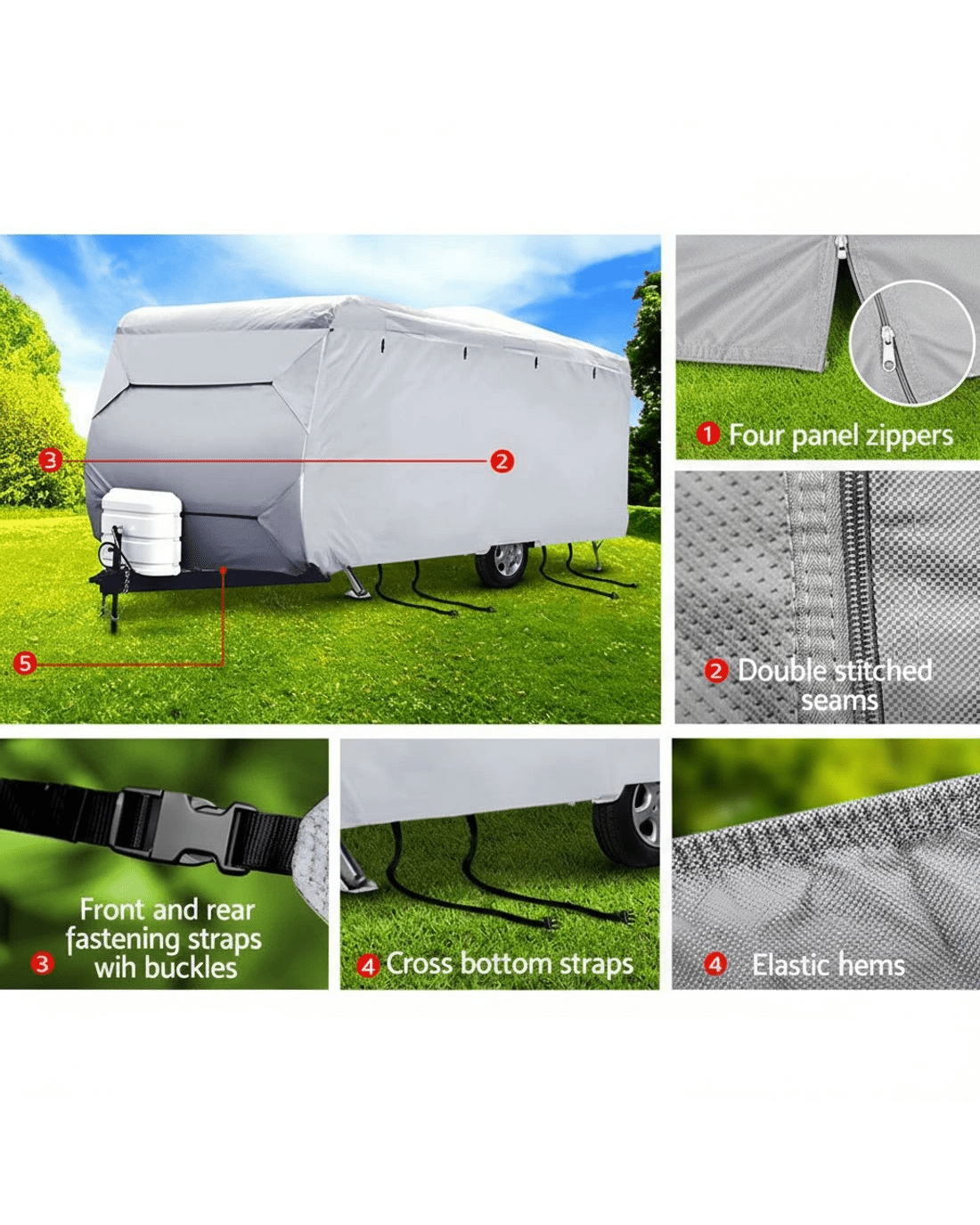 Putting on the cover is a breeze with the four sets of tie-down straps while the zipper door panels and openable four sides allow convenient access fast. The elastic hems, adjustable straps and buckles ensure a tight and secured fit. Not least, the tough interlocking seams make this caravan cover strong and sturdy in any weather condition.