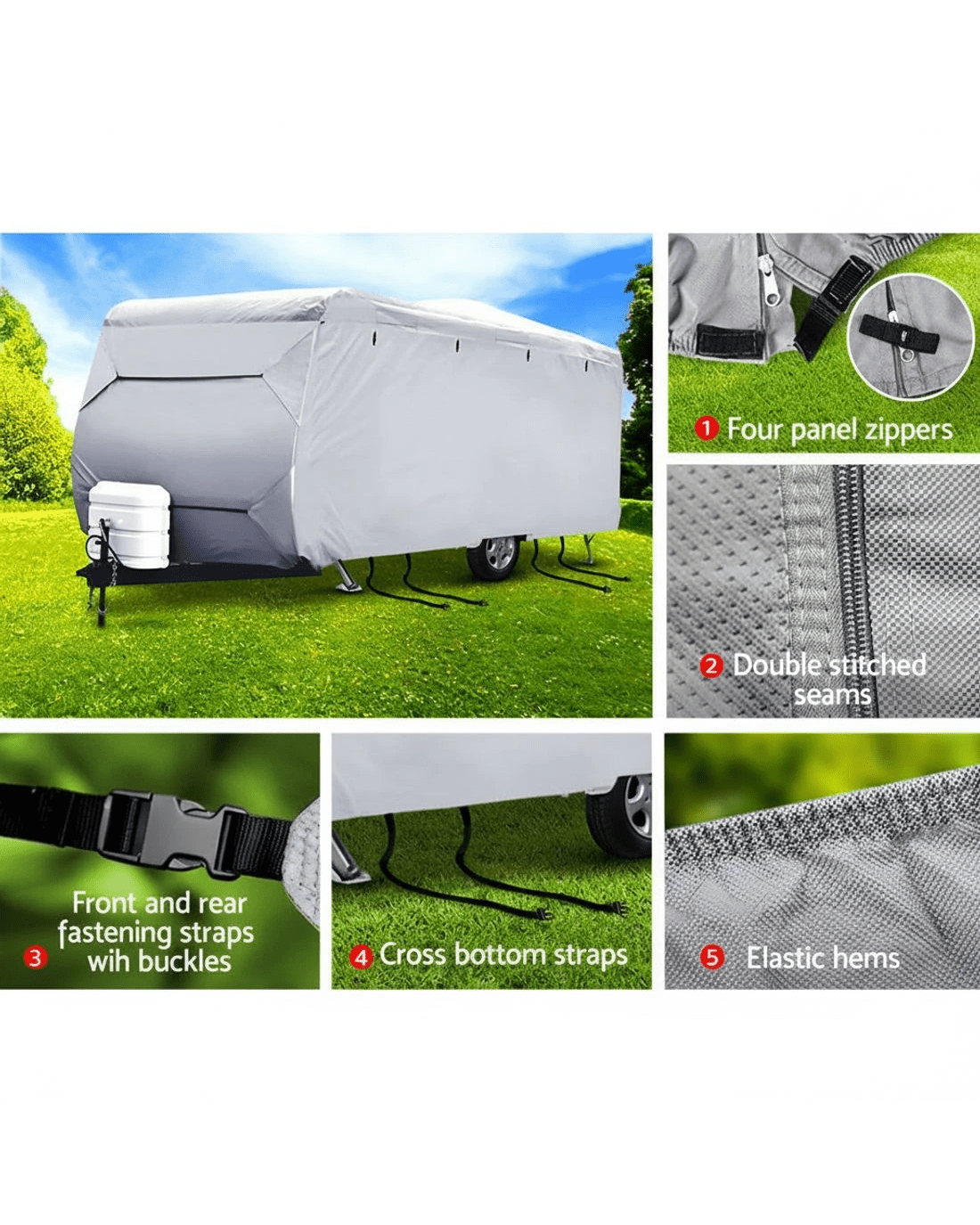 Putting on the cover is a breeze with the four sets of tie-down straps while the zipper door panels and openable four sides allow convenient access fast. The elastic hems, adjustable straps and buckles ensure a tight and secured fit. Not least, the tough interlocking seams make this caravan cover strong and sturdy in any weather condition.