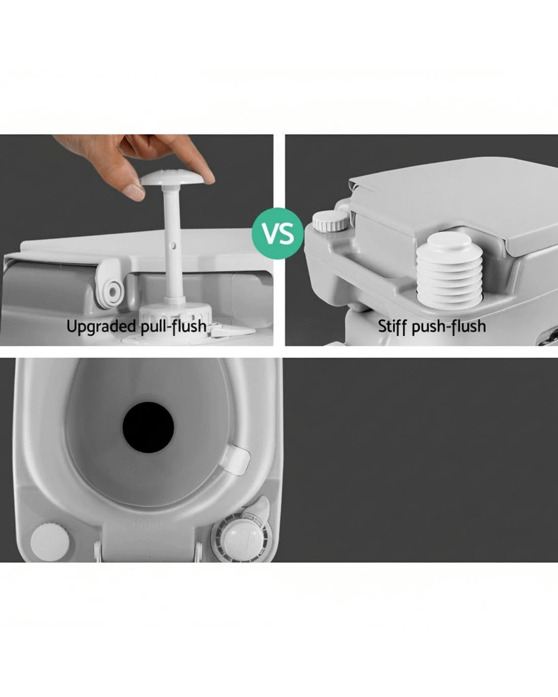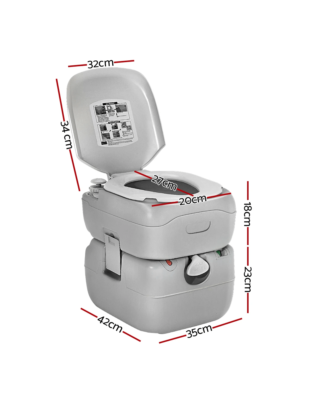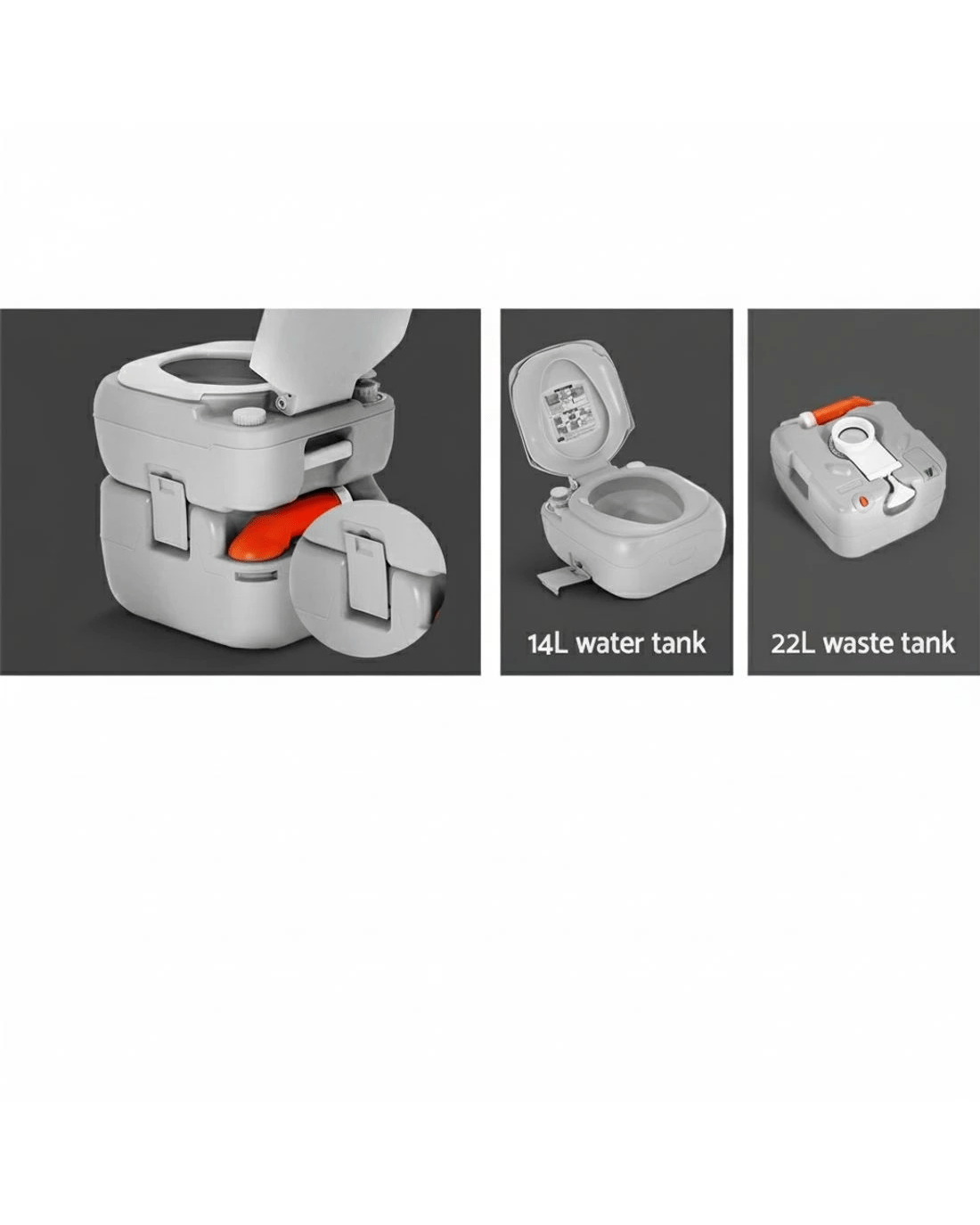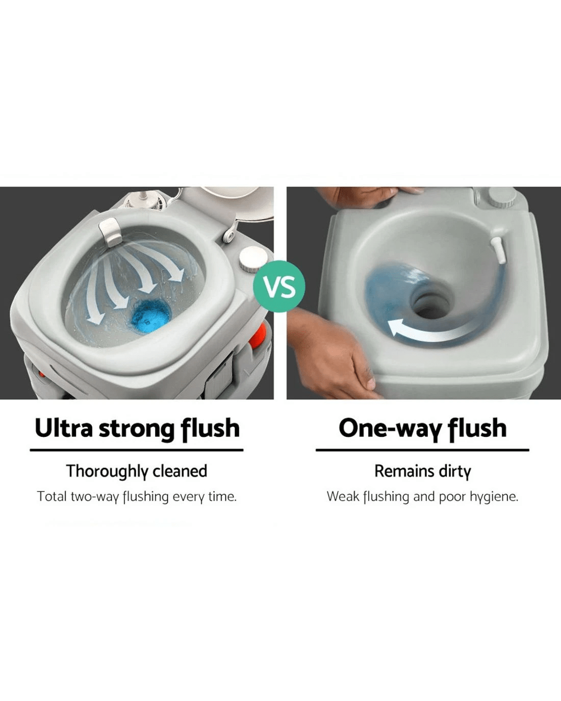 For instant relief while camping, nothing beats having this Weisshon 22L Portable Camping Toilet around. It features a high quality construction and generous water reserves. In fact, 14 litres of freshwater capacity that is good for up to 80 flushes. And unlike others, its two-way flush is ultra strong and ensures total and complete flushing for a thoroughly cleaned toilet. The double-sealed drain valve also protects against leakages and odours. The high-density construction makes it strong and durable while both the water and waste holding tanks are of one-piece construction with heavy-duty and corrosion resistant side latches locking the tanks together. The portable toilet has an attractive matte finish and is scratch-resistant. Not least, the 22-litre holding tank is detachable for easy disposal of contents and cleaning. With no power or water source required, our portable toilet is just perfect for your camping, picnic, marine or road trip.