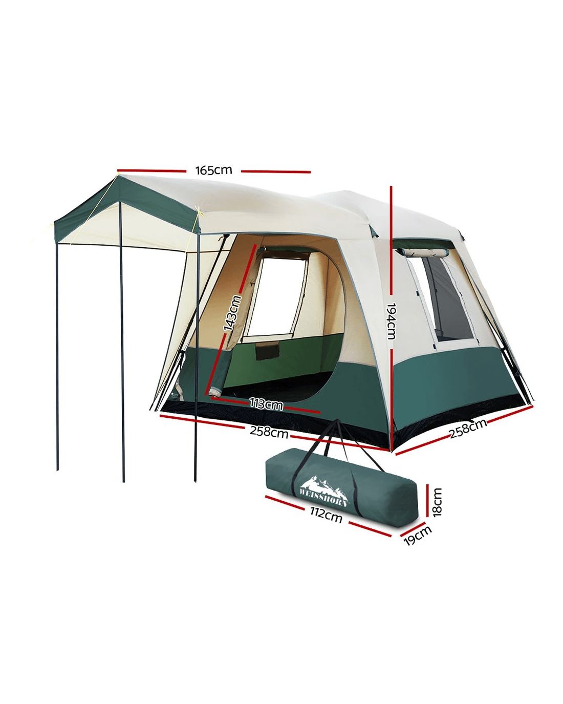 Overall dimensions (after full set-up): 258cm x 258cm x 194cm