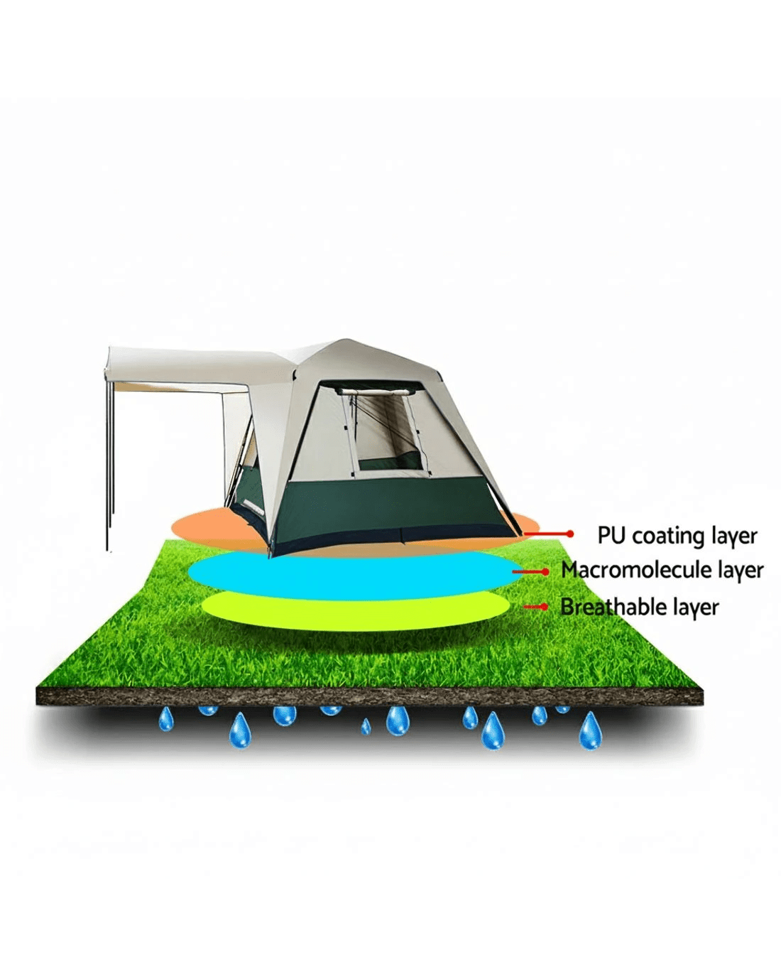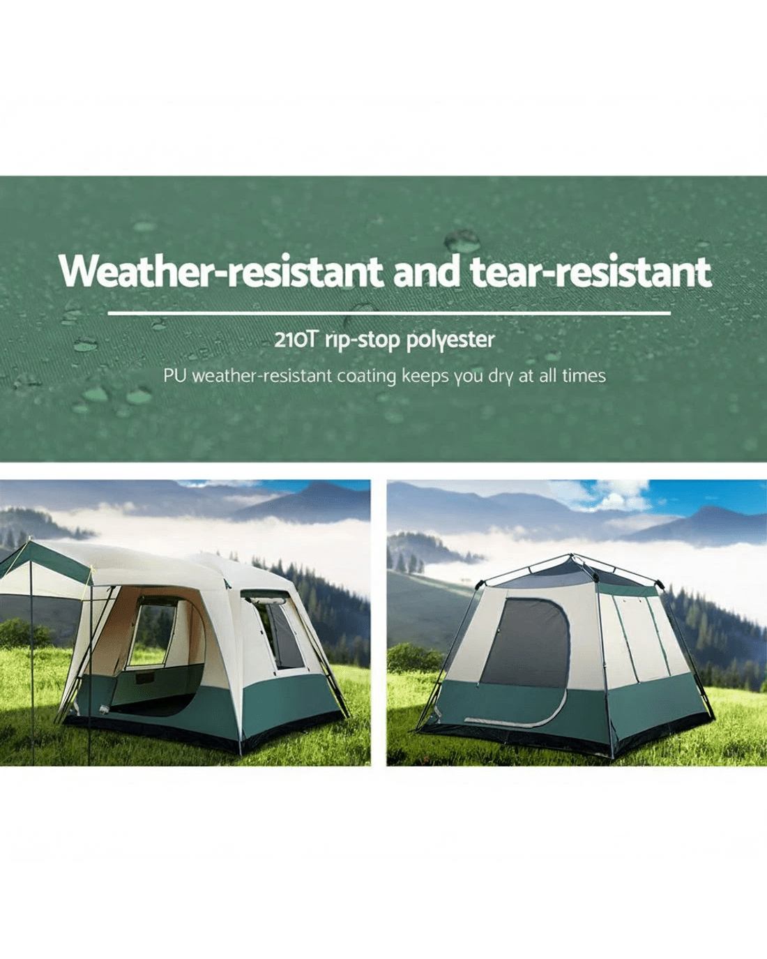 Embrace nature's call with our 4-person Weisshorn Instant Camping Tent. Designed for the true outdoor enthusiast, its robust polyester fly stands as a barrier against unpredictable weather. Wide windows and a door seamlessly merge the inside with the ambient sounds and coolness of the outdoors. And with a generous front vestibule, your adventure equipment finds a safe shelter. Dive deeper into nature's wonders, knowing that comfort, space, and reliability accompany you.