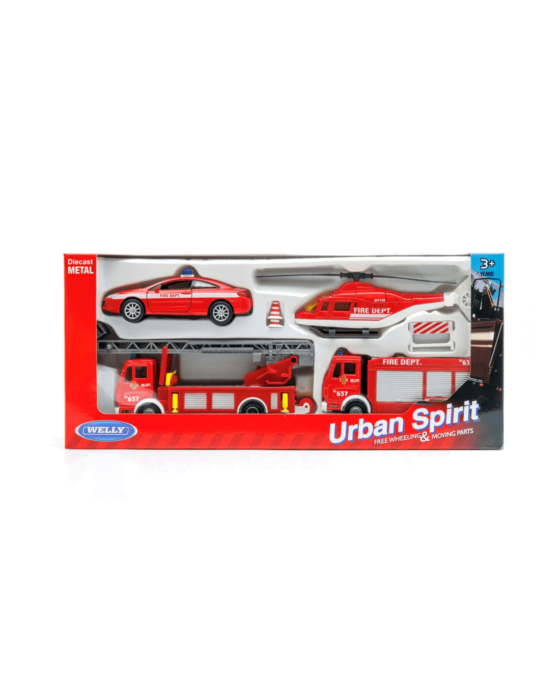 Your kid can go 'vroom vroom' around the house using this diecast metal Welly Urban Spirit Free Wheeling & Moving Parts Fire City Set - a great pick for engaging your kid for hours!