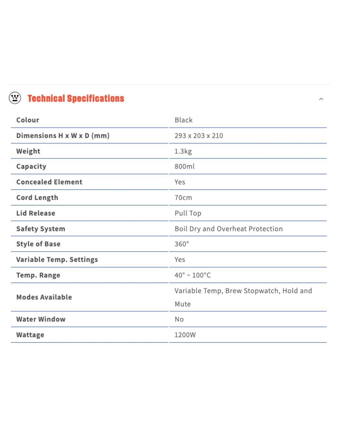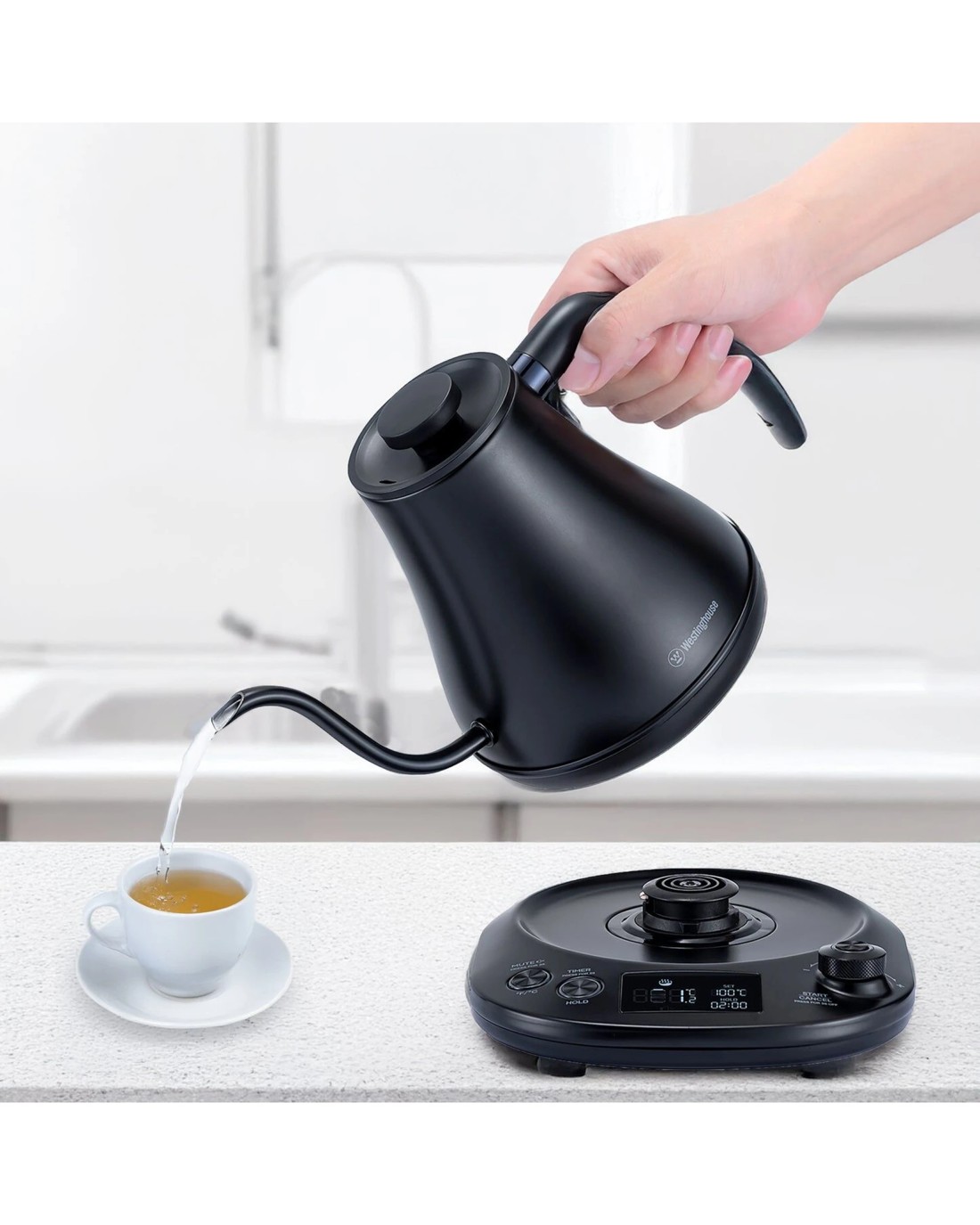 Brew like a barista in your own kitchen with the Westinghouse Gooseneck Kettle – a sleek, precision tool designed for tea lovers and coffee aficionados who like things just right. Whether you're perfecting a pour-over or steeping your favourite green, this stylish kettle brings pinpoint control and minimalist design together in one impressive little unit. Its 800ml capacity is ideal for single serves or small batches, while the variable temperature range (40°C to 100°C) lets you dial in your ideal brew temp to a tee. The gooseneck spout gives you flawless control over your pour, and the LCD screen with dial and button control puts everything you need at your fingertips. Even better, features like Hold (up to two hours), Mute, and a built-in brew stopwatch mean you can master every cup without fuss or noise.