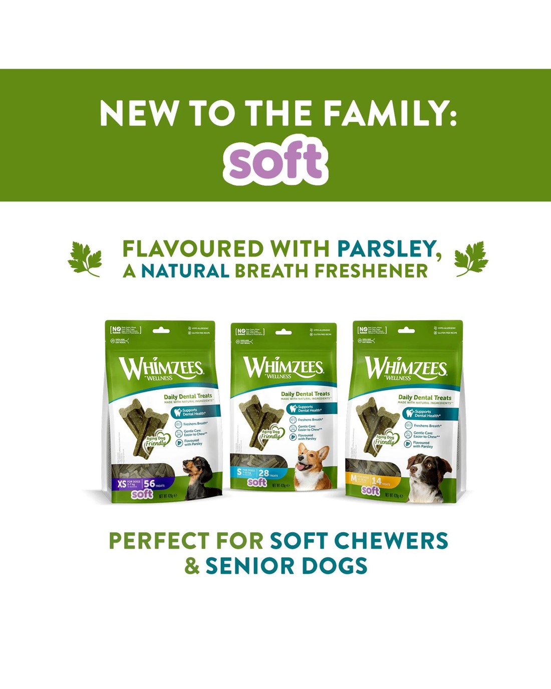 WHIMZEES® by Wellness Soft chews are 35% softer than our Adult Stix or Brushzees, which makes them easier to chew on, perfect for gentle chewers or senior dogs. Give your dog one WHIMZEES® per day and you're giving them a fun and healthy challenge!