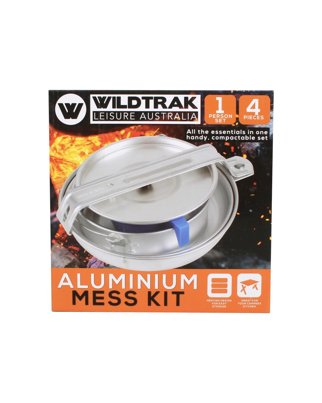 The WILDTRAK 4pc Aluminium 1-Person Mess Kit is designed for outdoor cooking and camping adventures. This complete set includes essential cookware items that are lightweight and durable, making meal preparation easy and convenient while on the go.